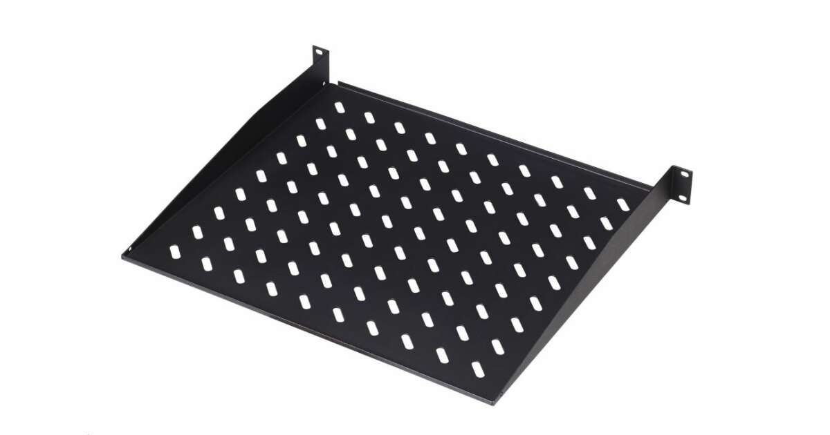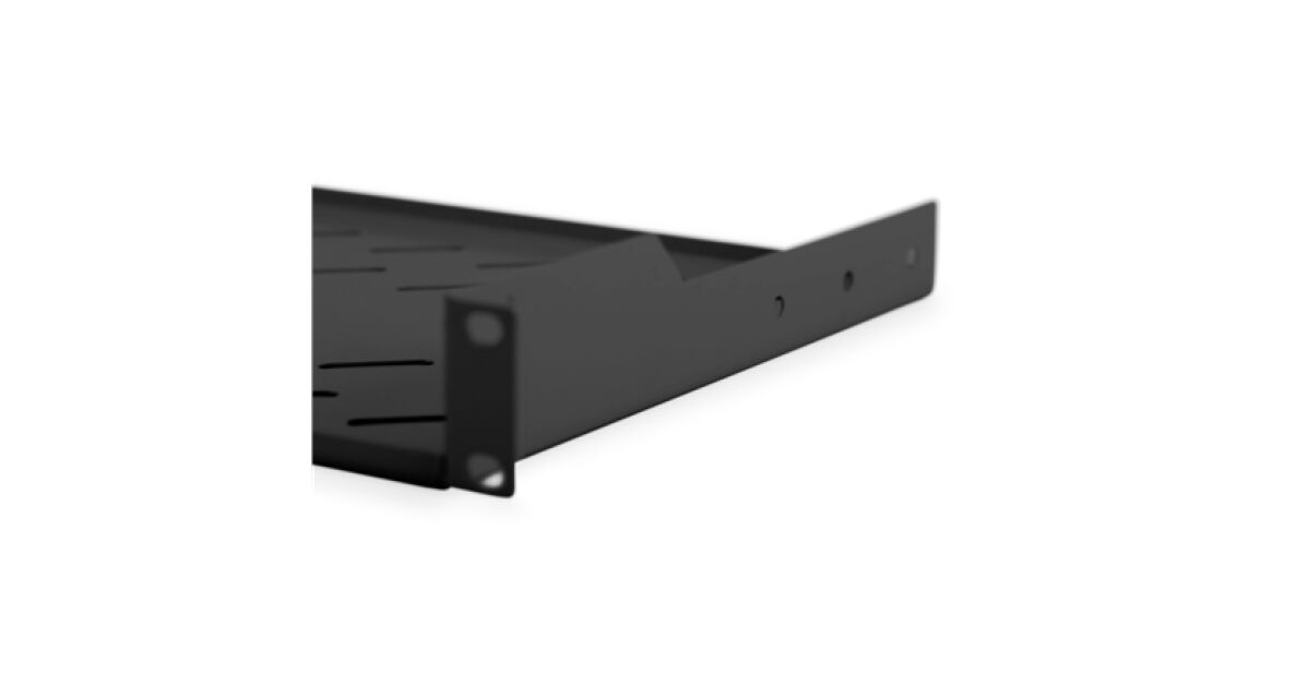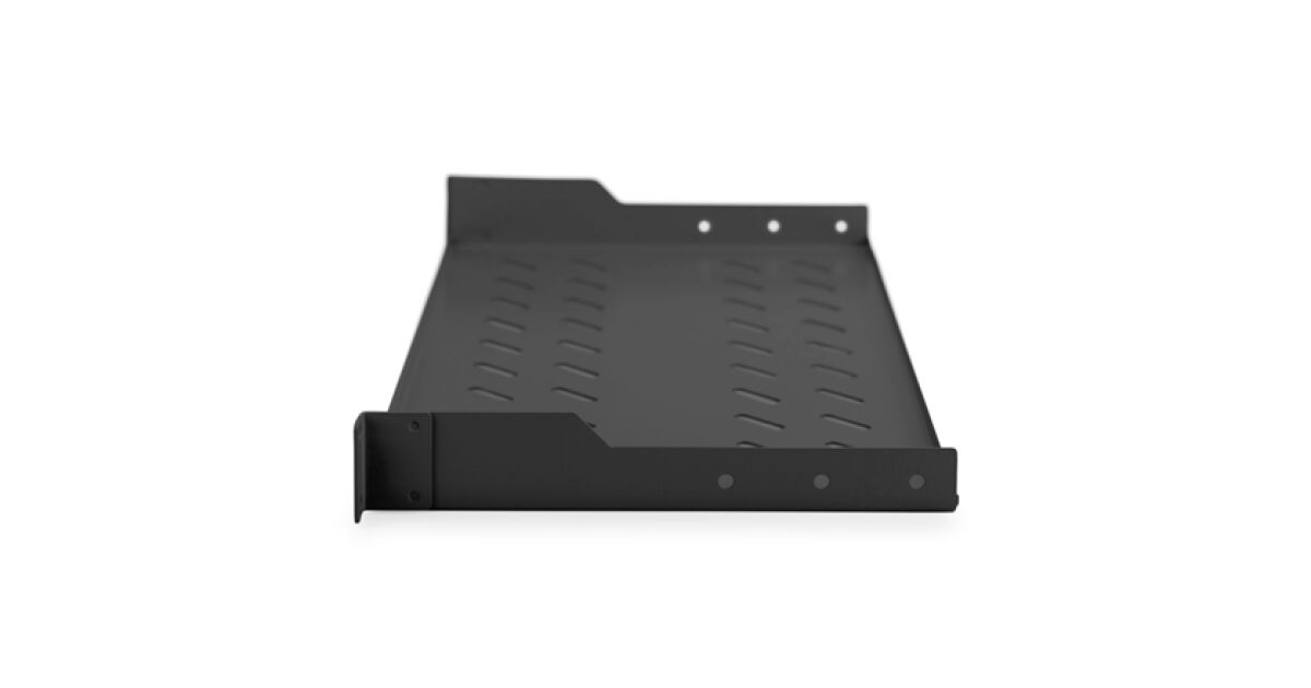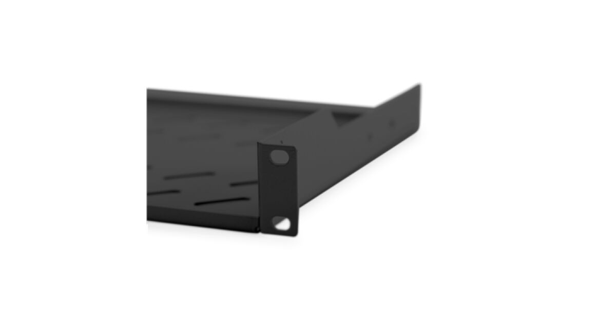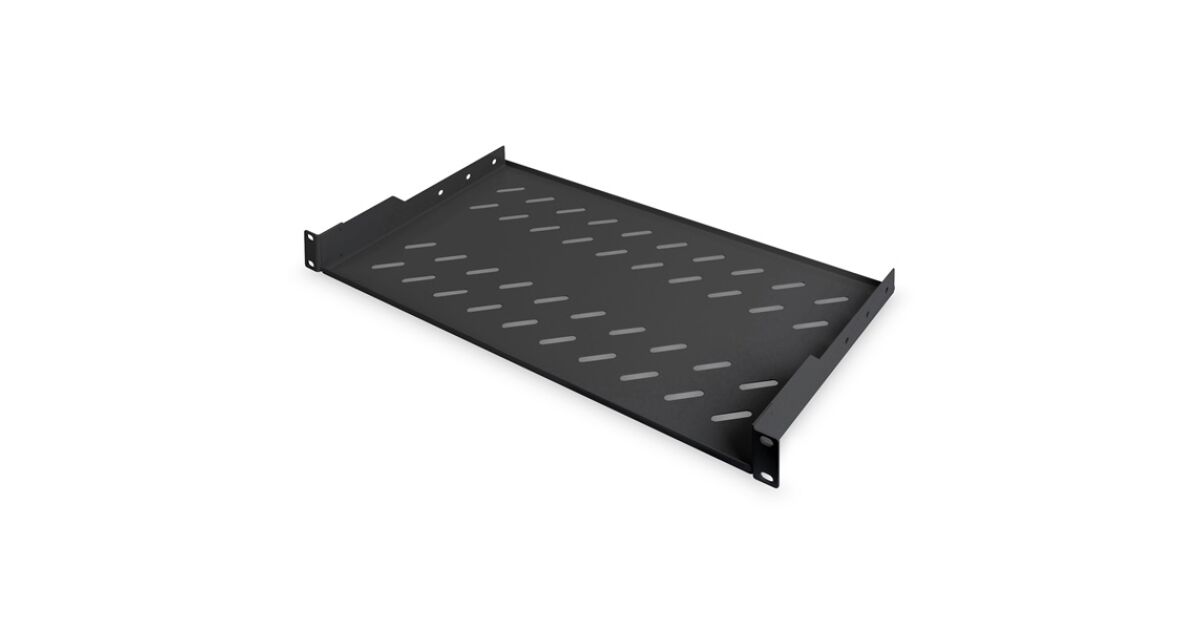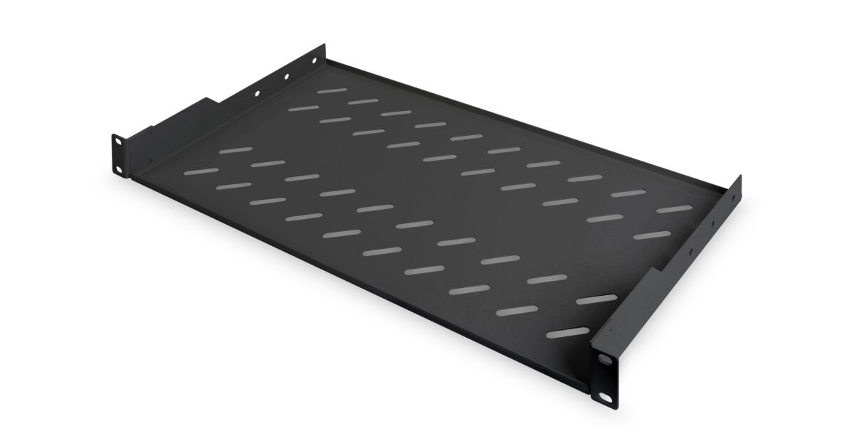 Digitus | Fixed Shelf for Racks | DN-19 TRAY-1-SW | Black | The shelves for fixed mounting can be installed easy on the two front 483 mm (19“) profile rails of your 483 mm (19“) network- or server cabinet. Due to their stable, perforated steel sheet with a high load capacity, they are the optimal surface for components which are not 483 mm (19”) suitable