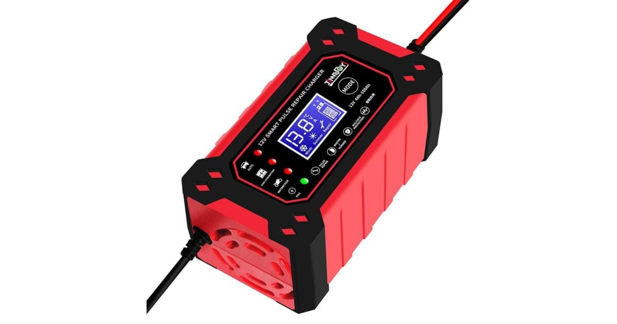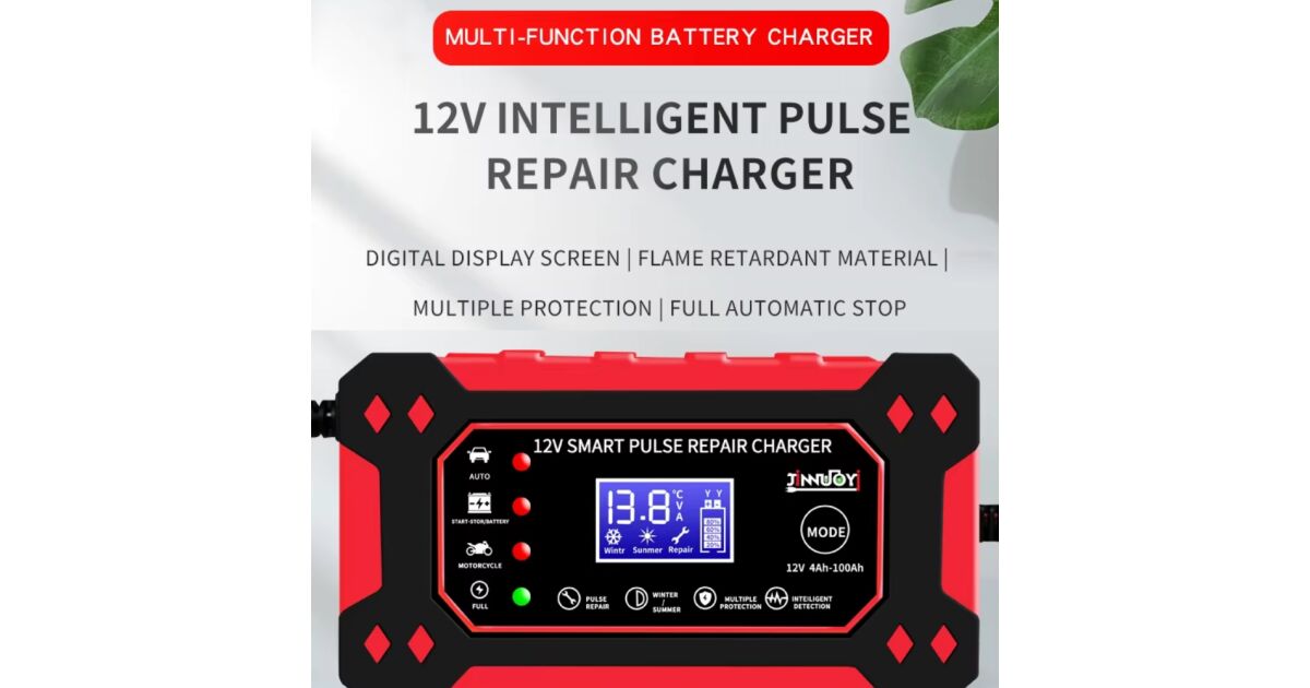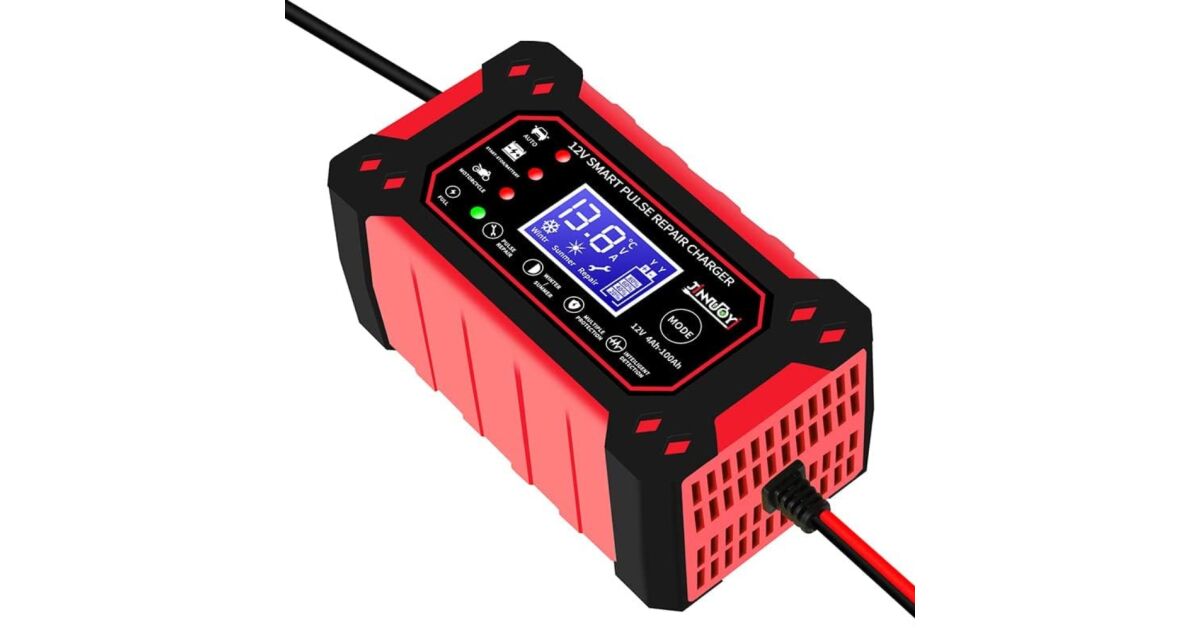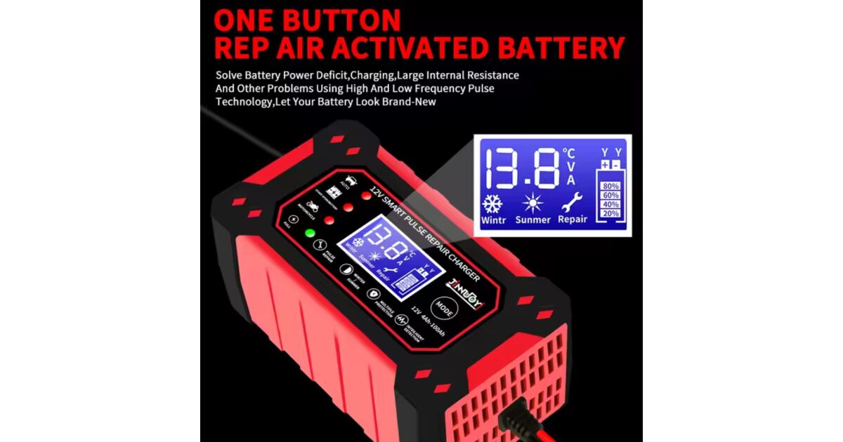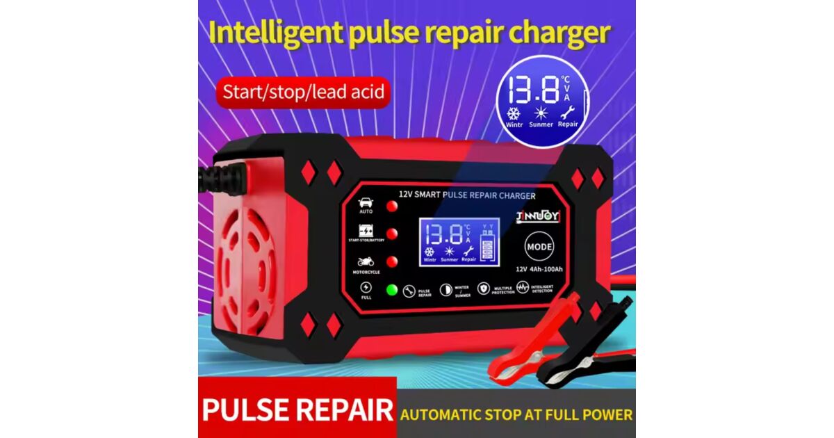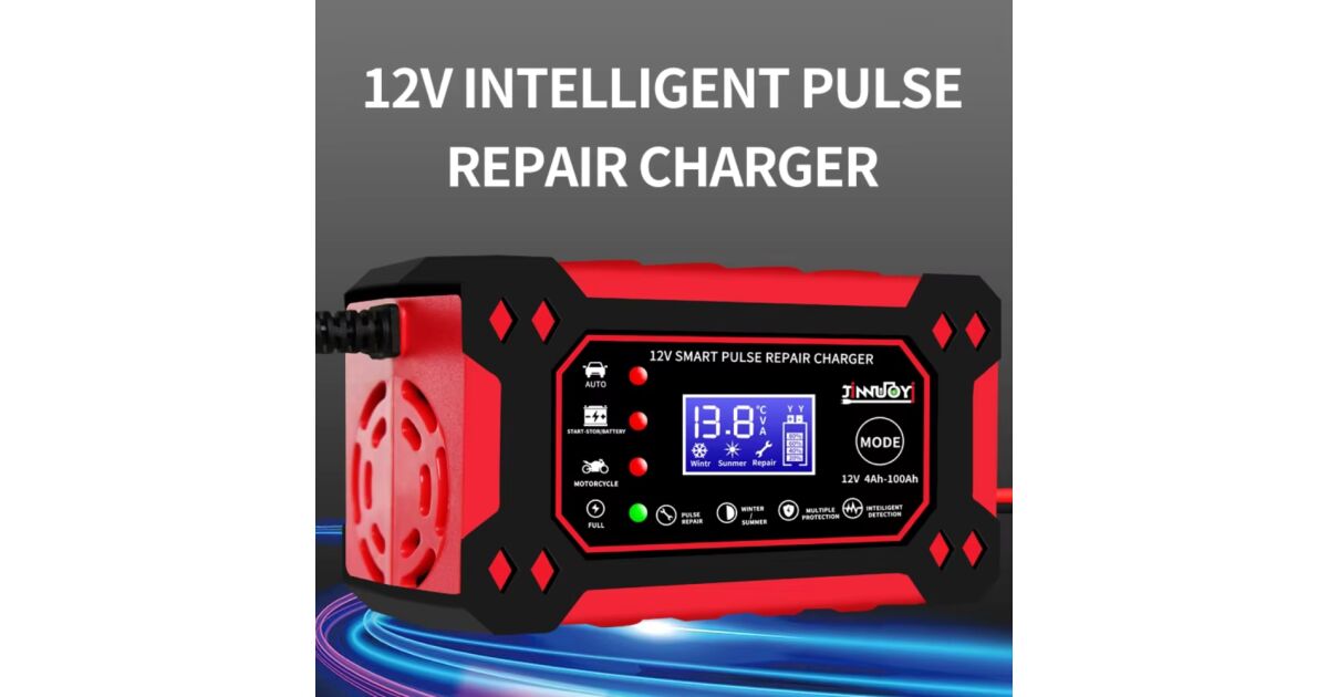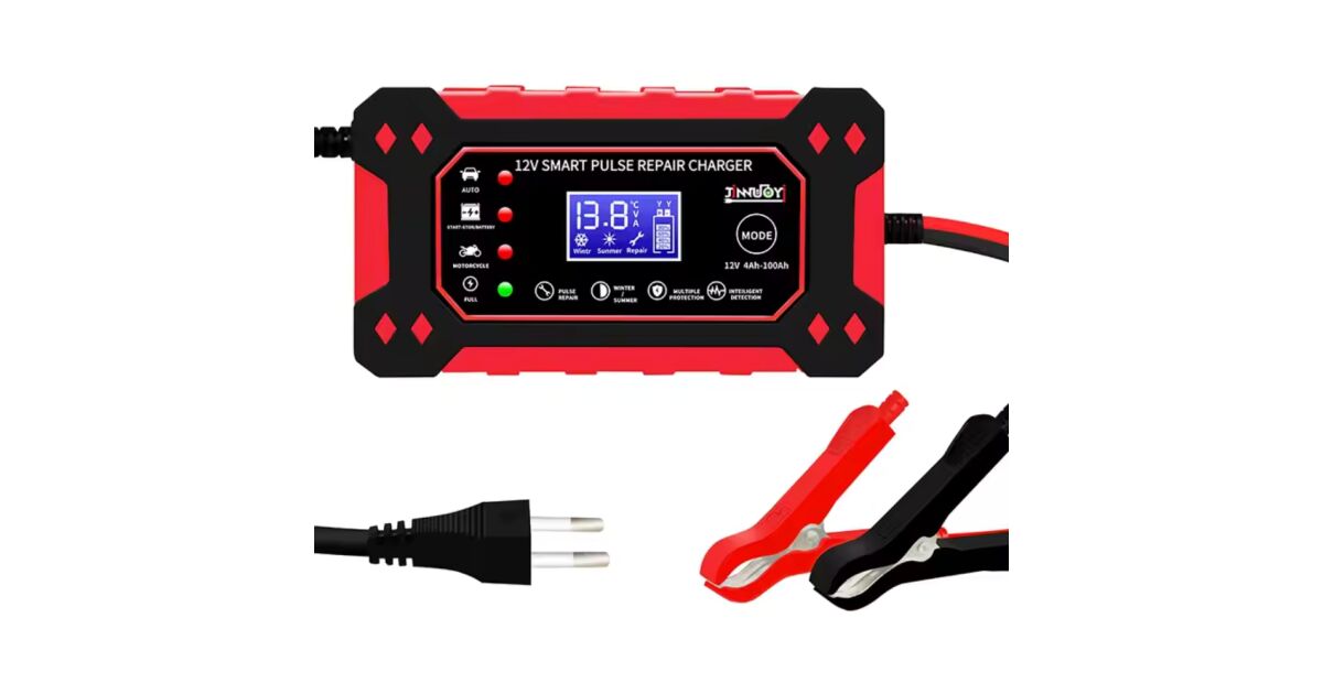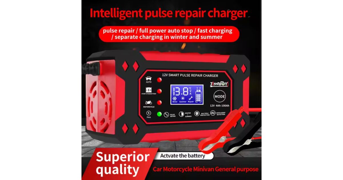 Inteligentny automatyczny prostownik do akumulatorów samochodowych 12V/5A, profesjonalny z funkcją naprawy i zabezpieczeniem w kolorze czerwonym