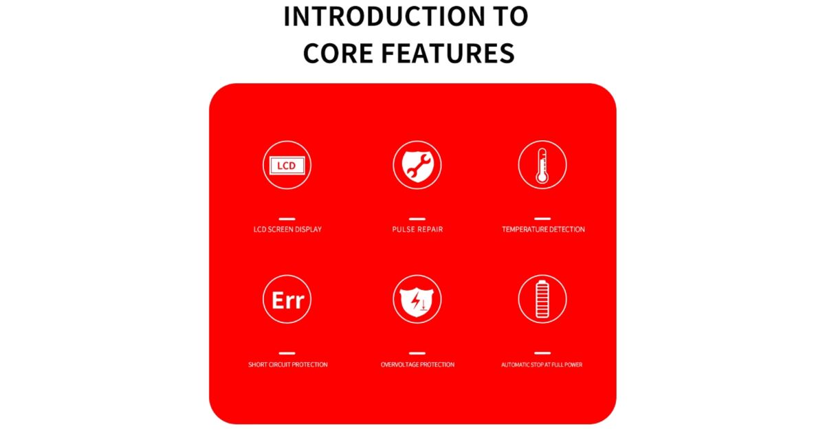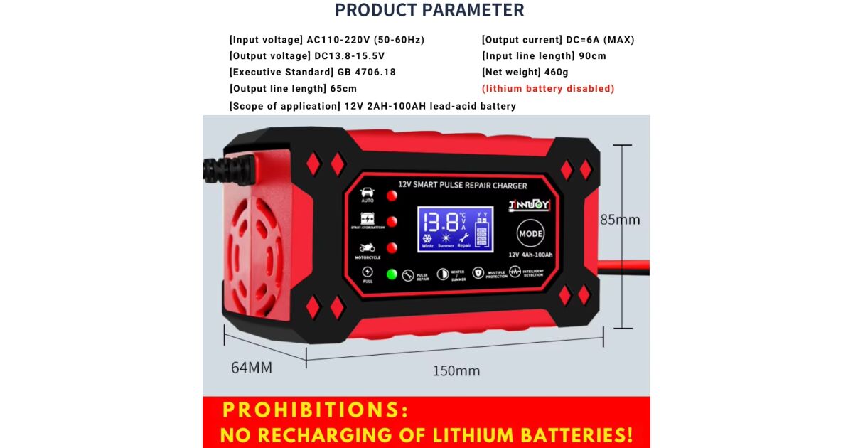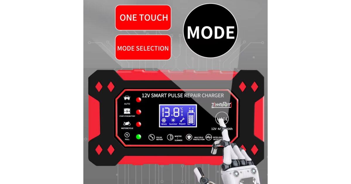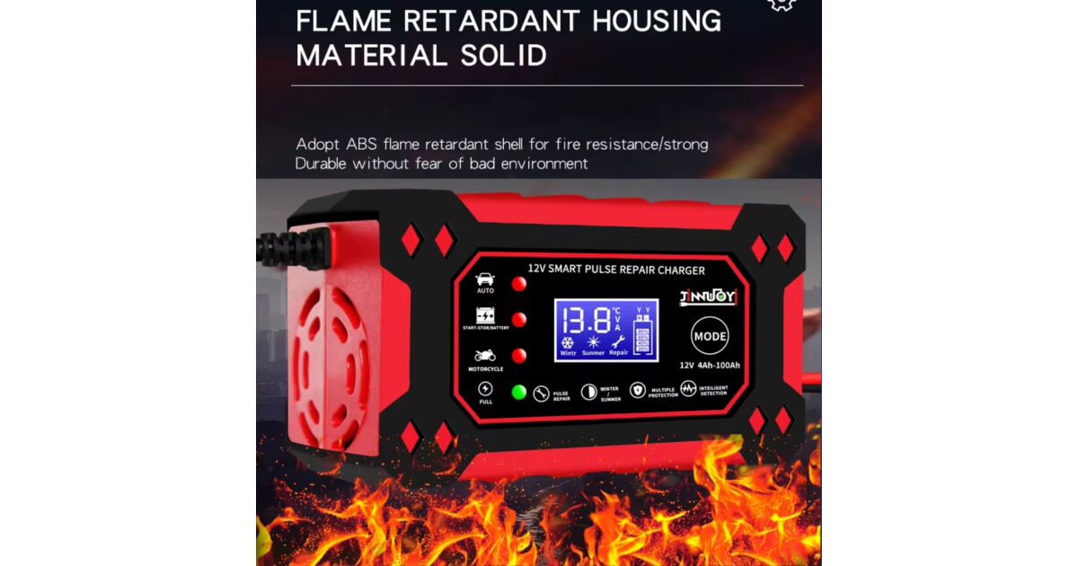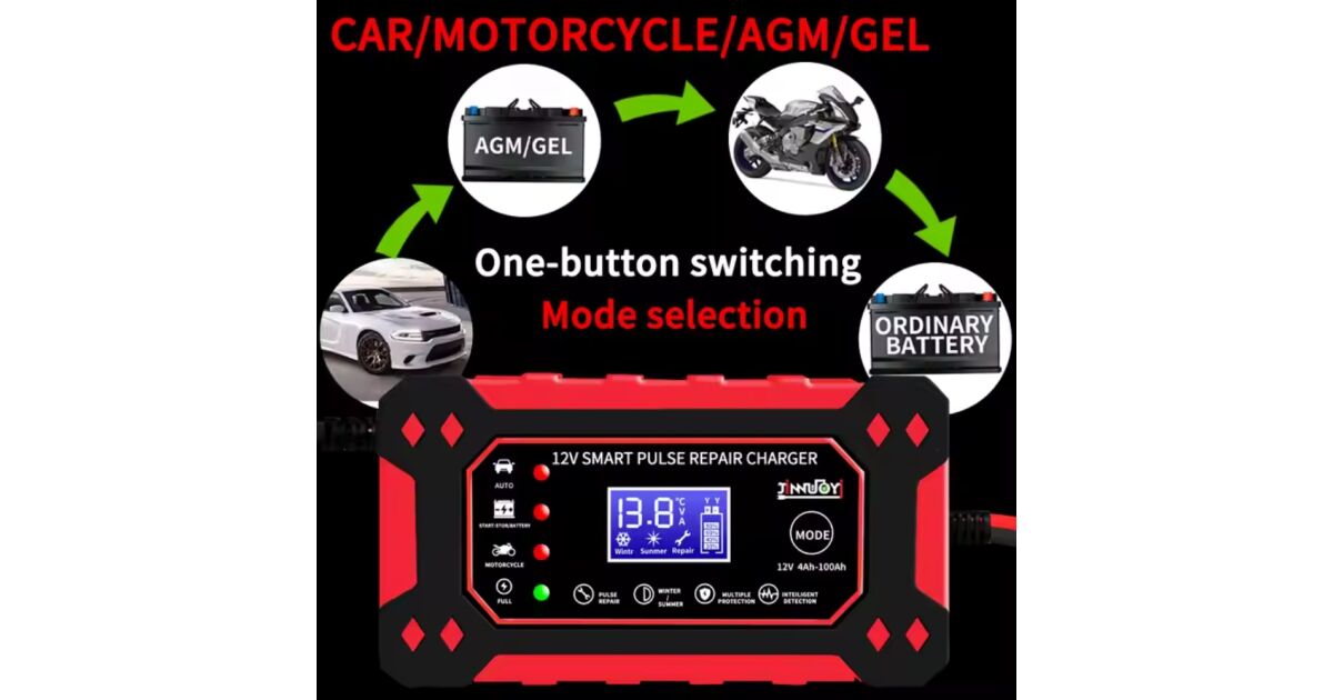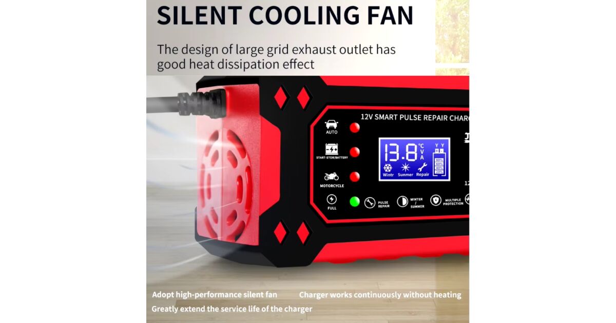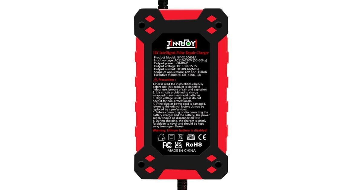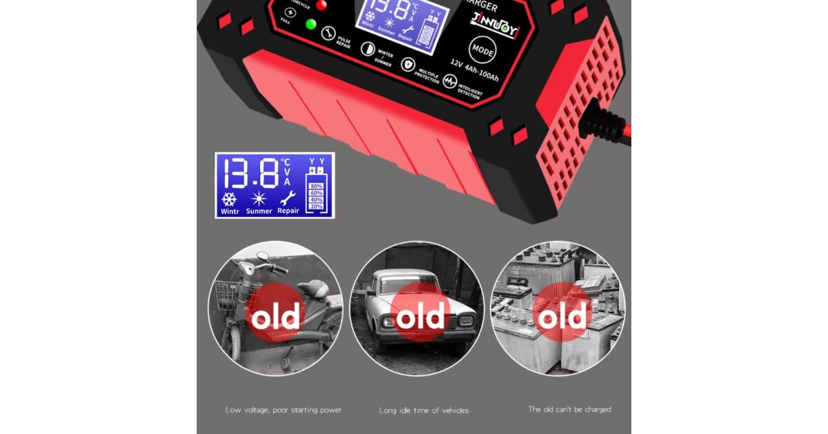 Inteligentny automatyczny prostownik do akumulatorów samochodowych 12V/5A, profesjonalny z funkcją naprawy i zabezpieczeniem w kolorze czerwonym
