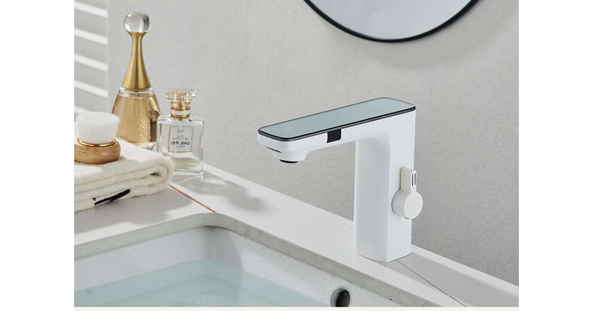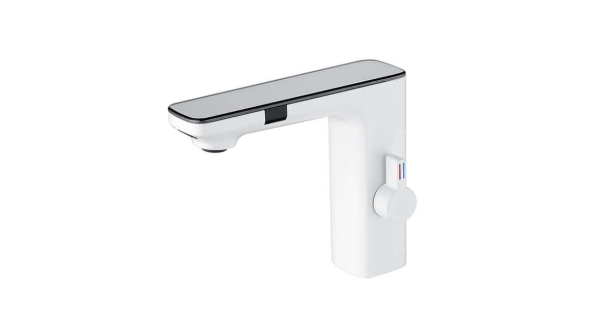 Bateria do zlewu łazienkowego, Blackswan, typ M225, model biały, z wyświetlaczem LCD i czujnikiem, rozmiar 18 cm opis