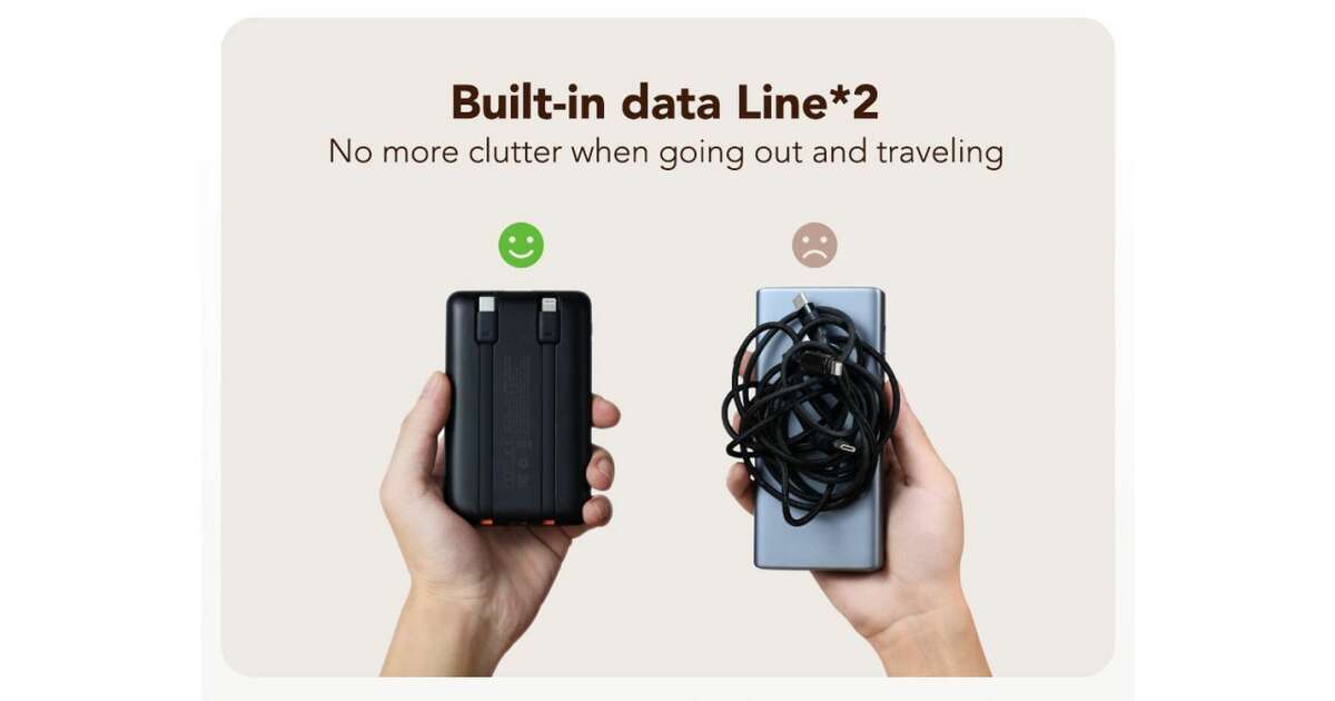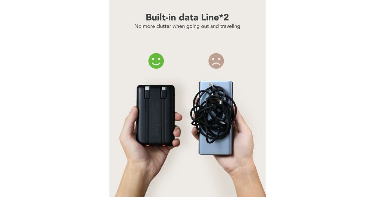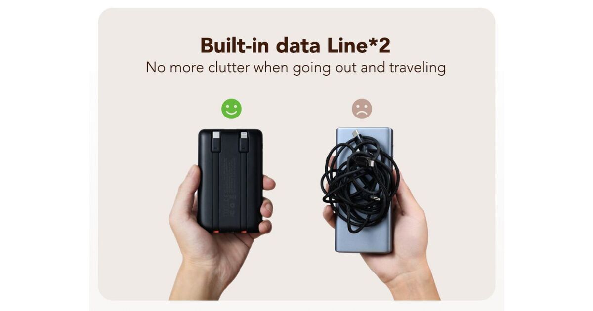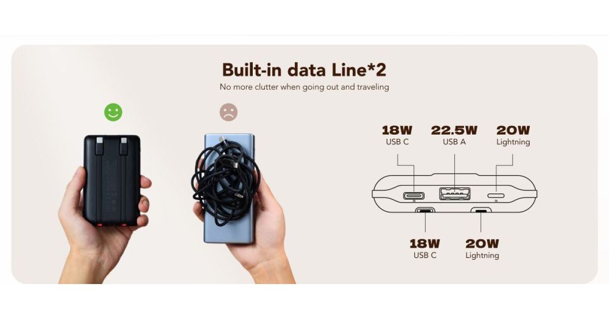 - Built-in Cables: USB-C and Lightning cables directly on the power bank.