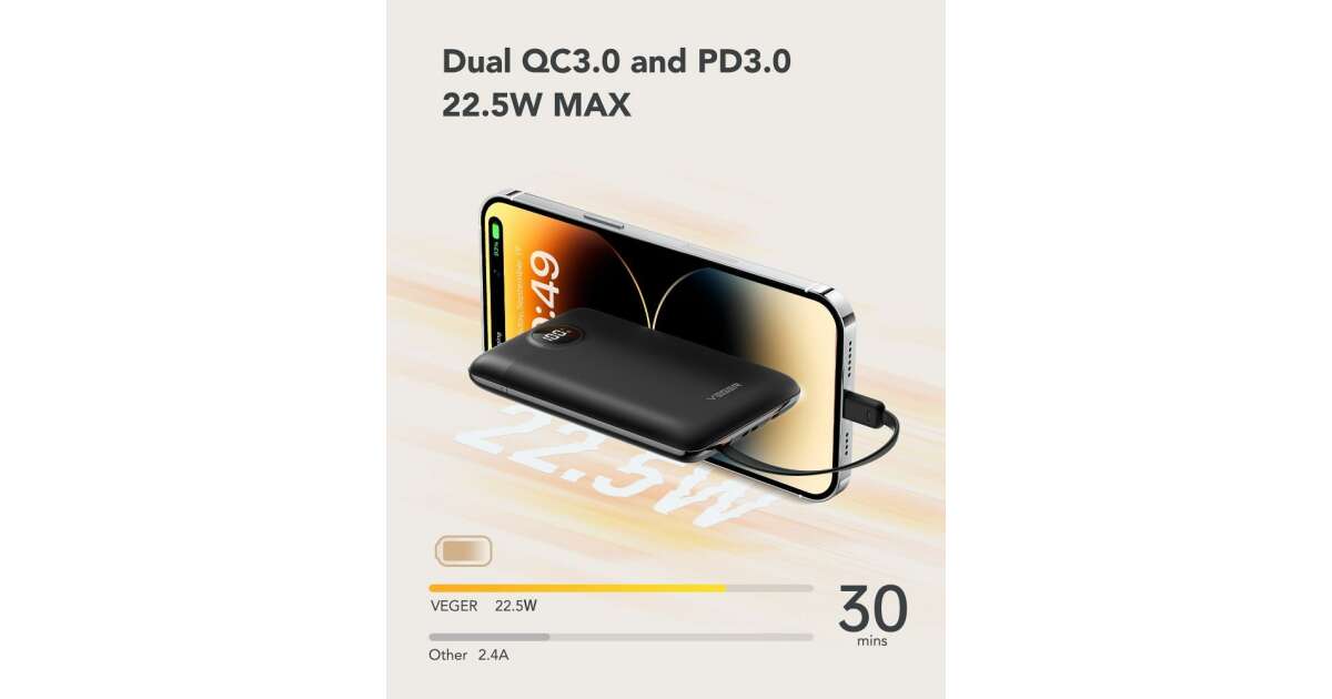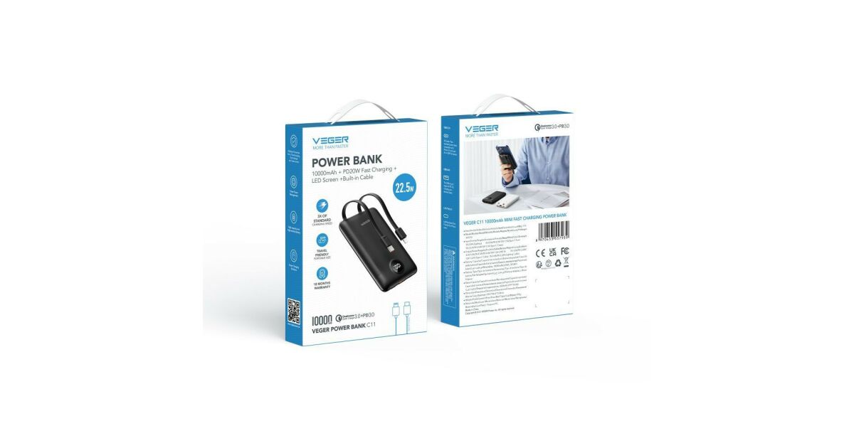 This compact and lightweight VEGER C11 power bank is the perfect companion for travel and everyday use. Thanks to the built-in USB-C and Lightning cables, charging is always at hand, without extra cables. 🚀