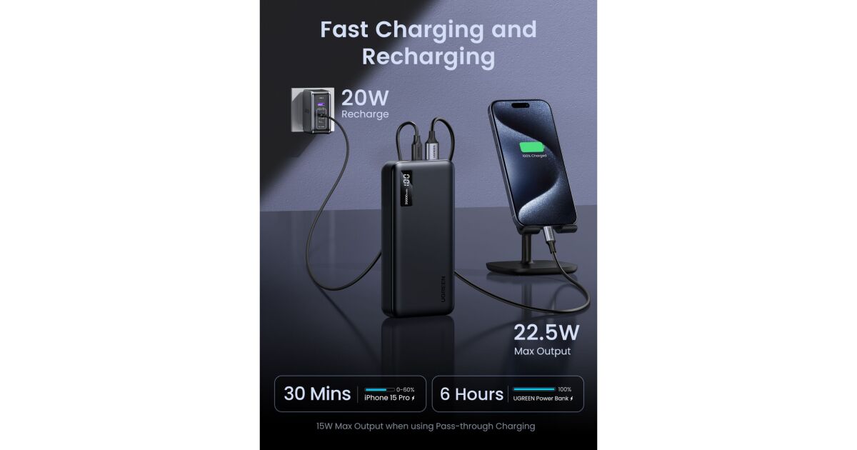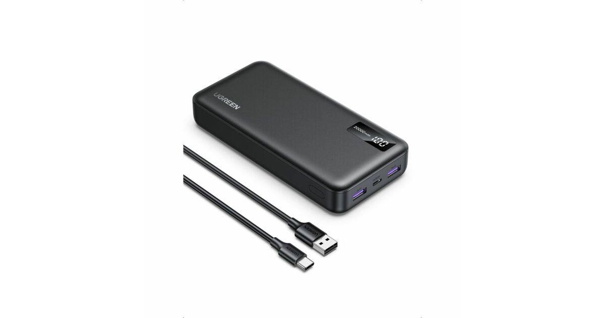 Zewnętrzna bateria Ugreen 20 000 mAh, 22,5 W, USB-C, USB-A, PD 3.0, wyświetlacz cyfrowy, w zestawie kabel USB-C do USB-A, czarny opis