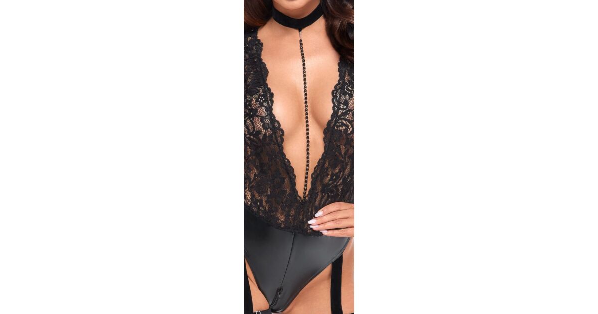 Noir Handmade F297 Libido Deep-V bodysuit with collar, pearl chain and garter L opis