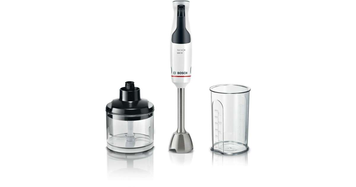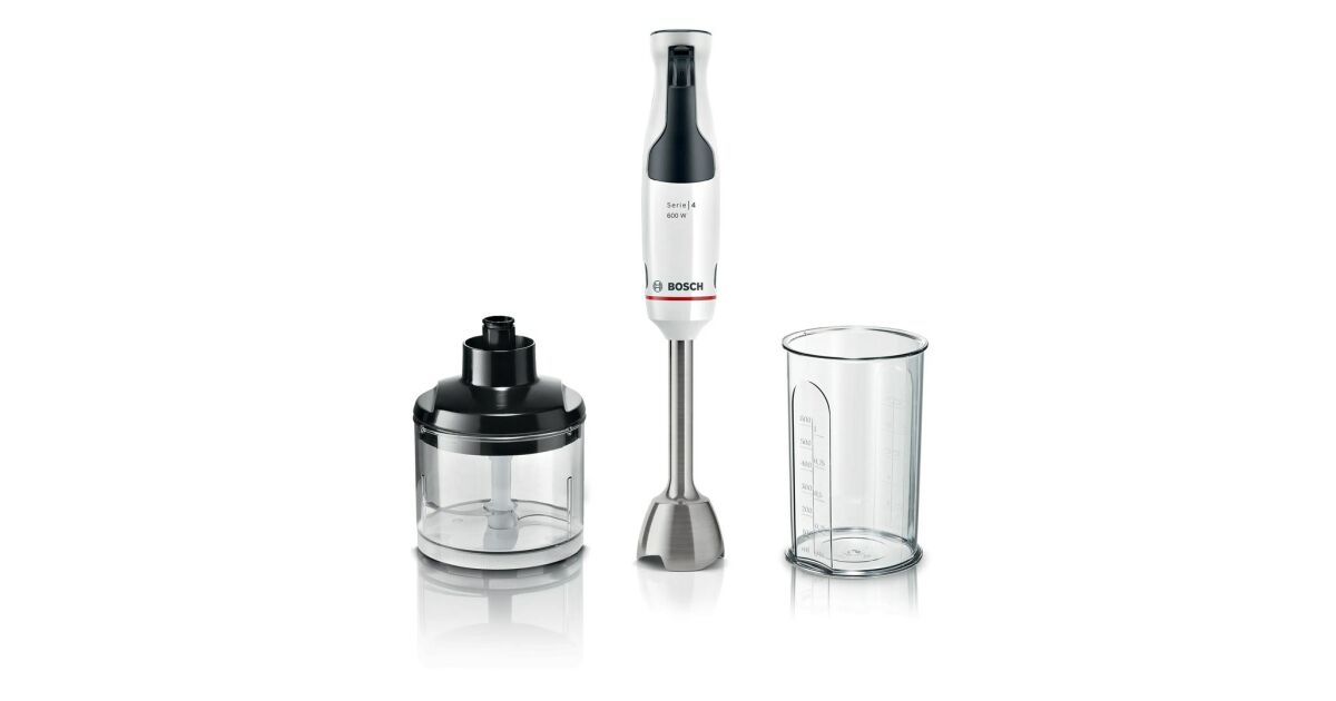 Blender Bosch MSM4W220, SER4, Blender, ErgoMaster, 600 W, dynamiczna kontrola prędkości, system QuattroBlade, dołączony blender, rozdrabniacz i miarka, biały
