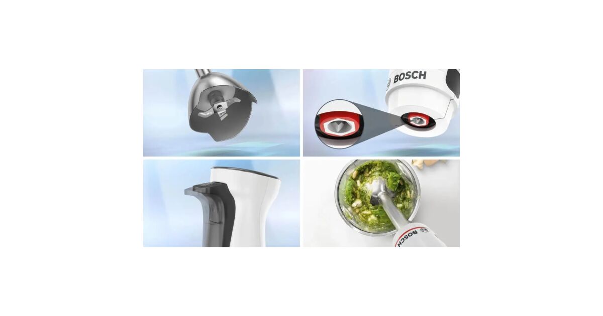Blender Bosch MSM4W220, SER4, Blender, ErgoMaster, 600 W, dynamiczna kontrola prędkości, system QuattroBlade, dołączony blender, rozdrabniacz i miarka, biały opis