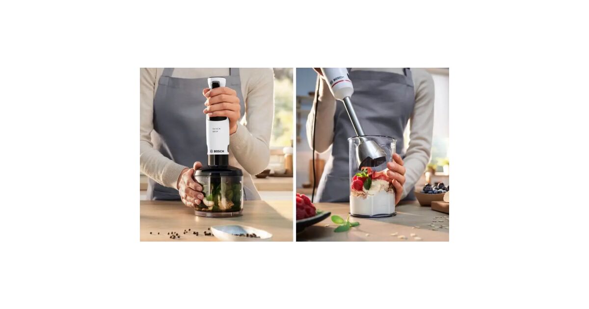 Ten mikser ręczny Bosch Serie 4 MSM4W220 to prawdziwe wielofunkcyjne urządzenie kuchenne, które ułatwia przygotowywanie posiłków. Dzięki mocy 600 W z łatwością sieka, miesza i blenduje. Z pomocą misy do siekania o pojemności 0,6 litra i praktycznego kubka z miarką można w nim przygotować wszystko, od zup krem po przeciery dla niemowląt.