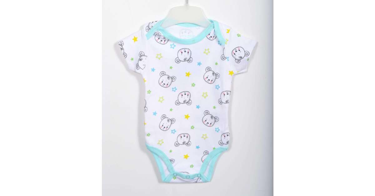To body dziecięce z krótkim rękawem, wykonane w 100% z bawełny, jest idealne dla dzieci w wieku 6-9 miesięcy (74 cm). Jest przyjemnie miękkie w dotyku, dzięki czemu zapewnia komfort noszenia przez cały dzień. Wesoły wzór srebrnego misia i gwiazdek ożywi garderobę Twojego malucha.