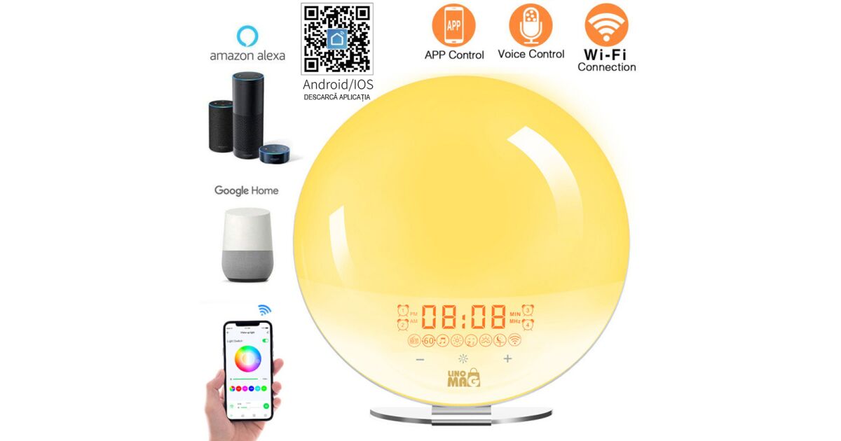 Radio FM z zegarem Linomag®, inteligentną lampą zachodzącego słońca, alarmem, symulacją wschodu i zachodu słońca, kontrolą aplikacji, Google i Alexa