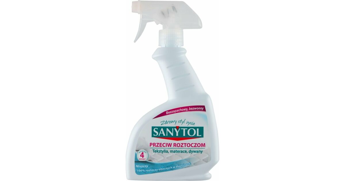 Pożegnaj się z roztoczami kurzu domowego dzięki temu skutecznemu sprayowi Sanytol! Bezchlorowa formuła w 100% eliminuje roztocza, zapobiega ich rozmnażaniu i utrzymuje czystość w Twoim domu. Działanie preparatu trwa 4 miesiące, zapewniając długotrwałą ochronę przed niemiłymi niespodziankami.