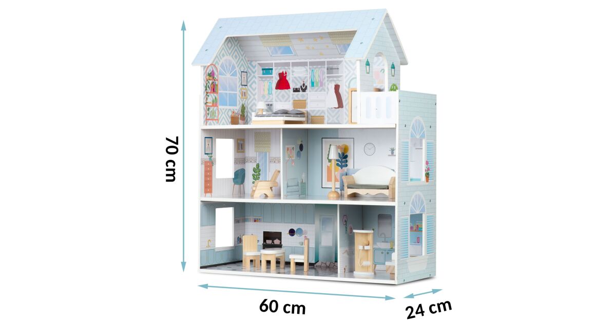 -Ricokids Duży drewniany domek dla lalek, 3 poziomy, 11 mebli, 5 pokoi, 70x60x24cm - Niebieski opis