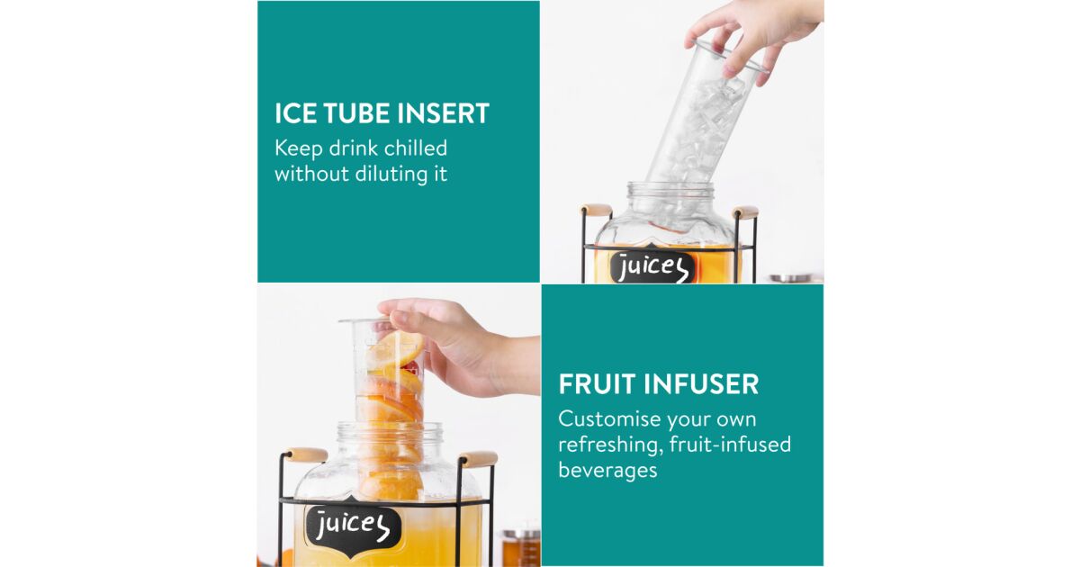 Dozownik do napojów Navaris, 5 l, kran ze stali nierdzewnej, z pojemnikiem na owoce i rurką do lodu, NAV0000111P003C opis