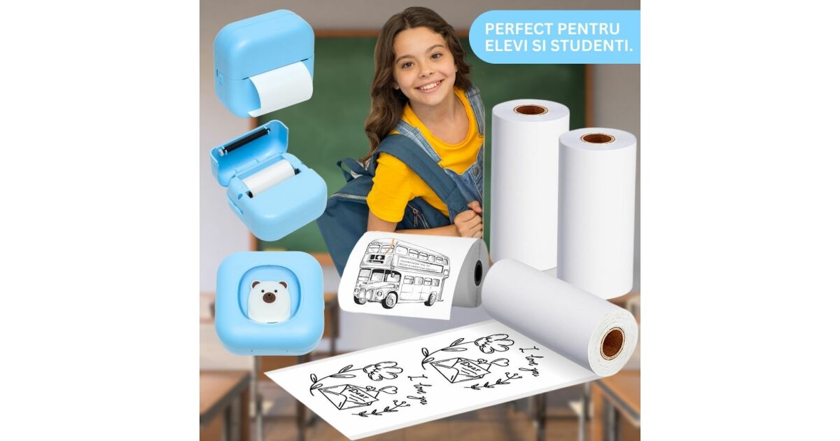 Mini przenośna drukarka MX3U, NIEBIESKA, z Ursulet, EALMEU®, Bluetooth, aplikacją na telefon, kompatybilna z IOS/Android, termiczna, bez tonera, zintegrowany akumulator, 5 białych rolek samop