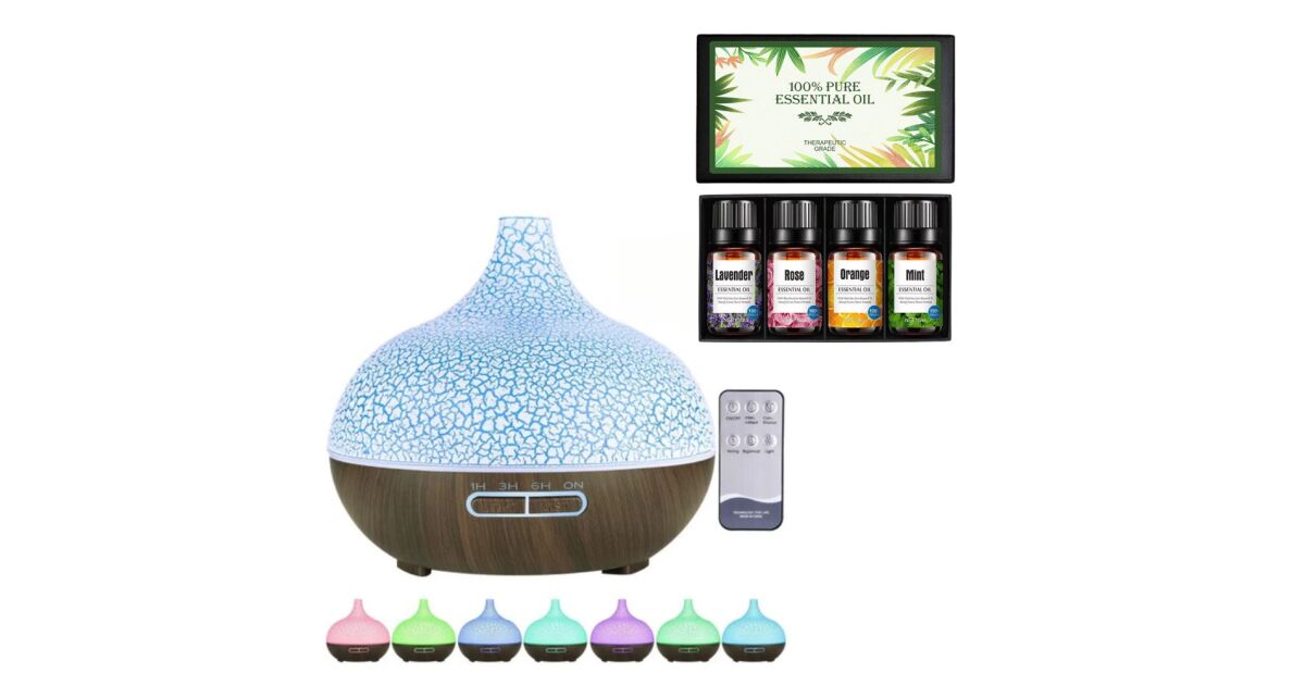 Ultradźwiękowy dyfuzor zapachowy z 7 kolorami i zestawem olejków eterycznych: Relaksujące odświeżanie powietrza i kontrola wilgotności 💧