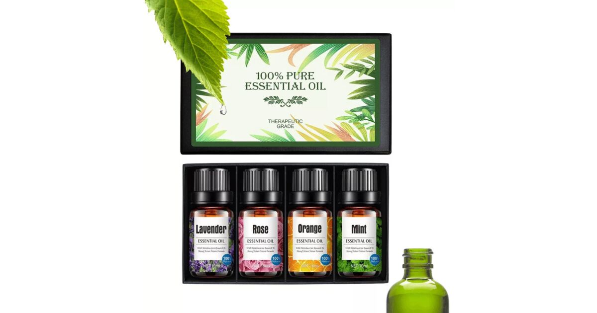 - 4-częściowy zestaw olejków eterycznych Pulaiyi: Zapachy lawendy, róży, pomarańczy i mięty.