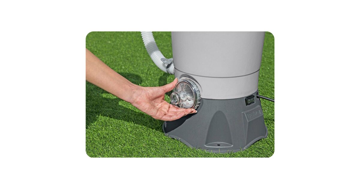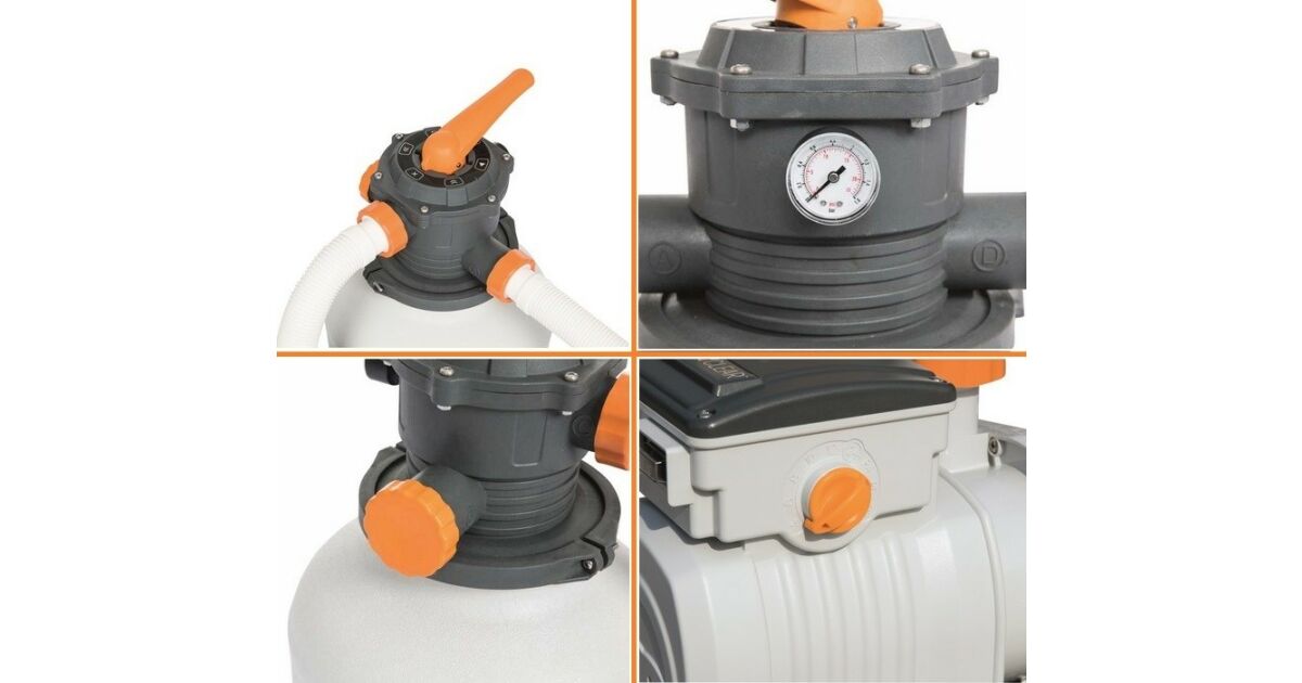 Pompa posiada solidny, odporny na korozję zbiornik. Górną pokrywę można obracać o 360 stopni, co umożliwia łatwe podłączanie węży z dowolnej strony urządzenia. Posiada również 6-pozycyjny uchwyt, który umożliwia łatwe przełączanie między funkcjami filtracji, zamknięcia, płukania wstecznego, płukania, opróżniania i cyrkulacji. Wbudowany manometr umożliwia łatwy odczyt ciśnienia w zbiorniku. Pompa zawiera filtr, który oddziela liście i inne grubsze zanieczyszczenia.