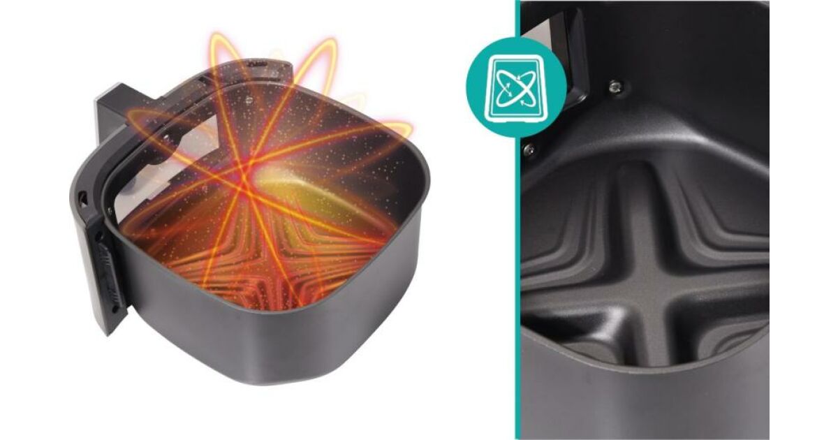 Technologia Cross Wave. Pofałdowane dno kosza piekarnika optymalizuje cyrkulację powietrza, zapewniając szybsze i bardziej równomierne gotowanie. Równomierny, 360-stopniowy przepływ powietrza zapewnia, że każdy centymetr potrawy otrzymuje taką samą ilość ciepła, eliminując potrzebę ciągłego potrząsania lub obracania.