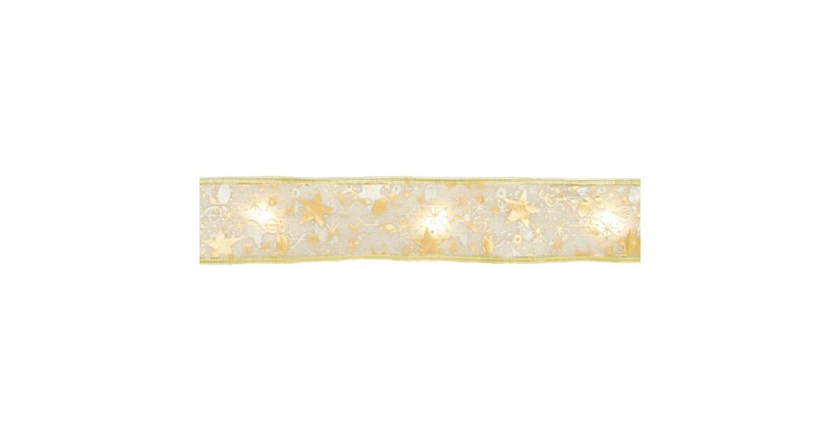 Stwórz świąteczny nastrój w swoim domu dzięki tej pięknej, 5-metrowej taśmie LED! Ciepłe białe diody LED umieszczone na satynowej taśmie w złotym kolorze z wzorem gwiazdek zapewnią przyjemne, przytulne światło. Idealna na choinkę, do dekoracji prezentów lub innych świątecznych ozdób.