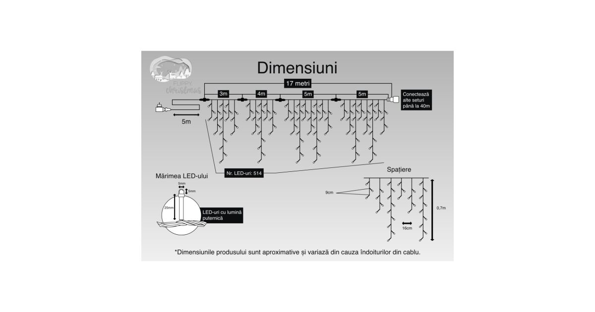 Instalacja świąteczna, 17 m, 514 diod LED, Frędzle, Zimna biel, 8 efektów świetlnych, Transformator z pilotem, Możliwość łączenia, Przewód przedłużający 5 m w zestawie, Czarny przewód, Flippy opis