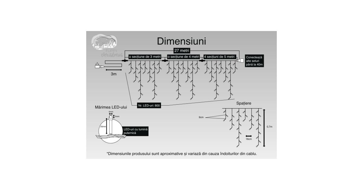 Instalacja świąteczna, 27 m, 800 diod LED, frędzle, zimna biel, lampa błyskowa, transformator z pilotem, możliwość łączenia, w zestawie przedłużacz 3 m, czarny przewód, Flippy opis