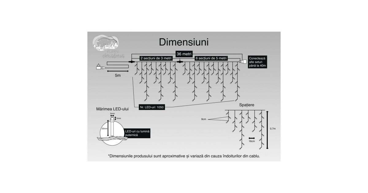 -Instalacja świąteczna, 36 m, 1050 diod LED, frędzle, zimna biel, lampa błyskowa, transformator z pilotem, możliwość łączenia, w zestawie przedłużacz 5 m, czarny przewód, Flippy