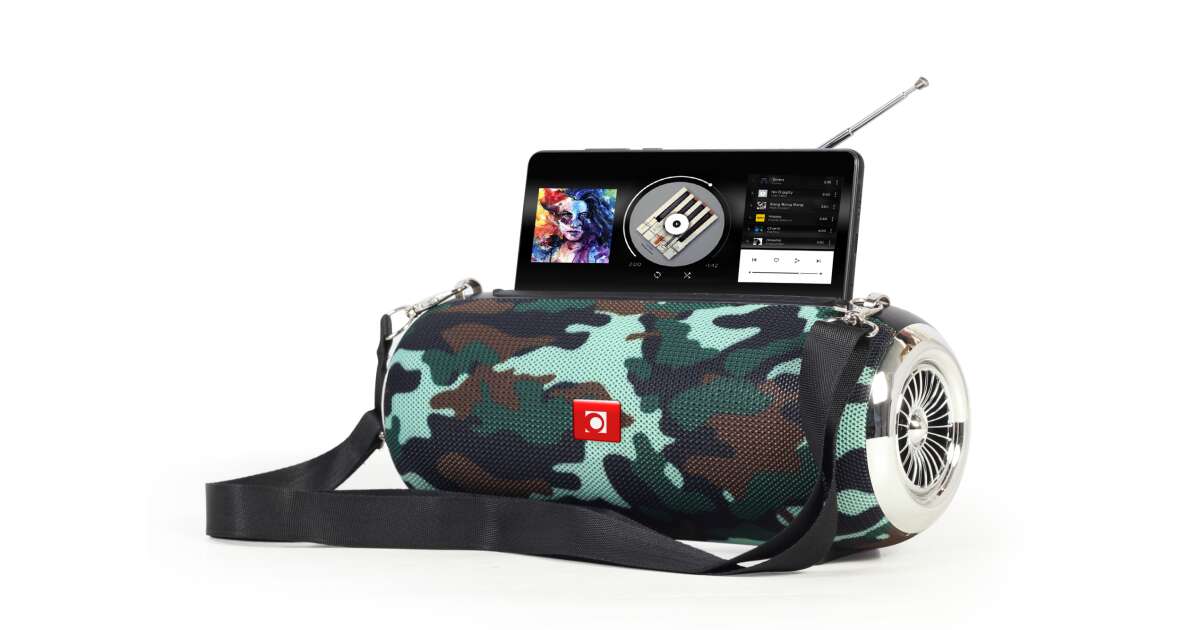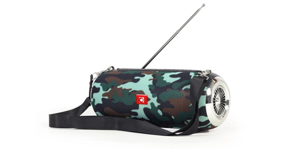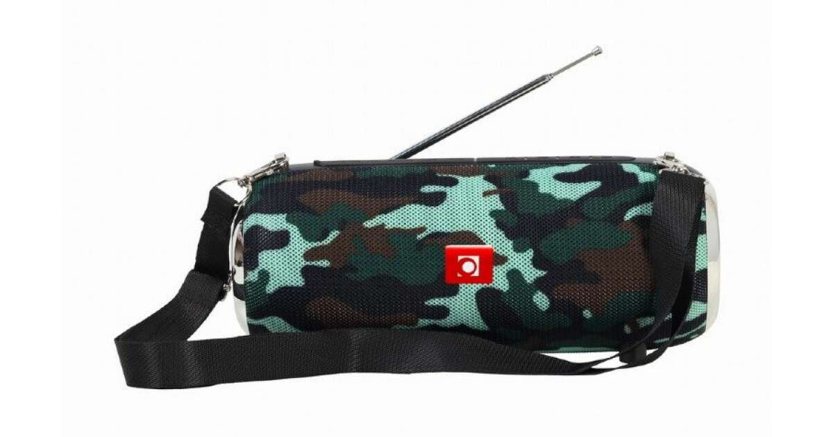Przenośny głośnik Bluetooth z wbudowanym radiemPrzenośny głośnik Bluetooth z radiem FM. Zintegrowana wysuwana antena zapewnia doskonały odbiór radia FM. Idealny do użytku z telefonem komórkowym lub tabletem. Zasięg sygnału wynosi do 10m. Głośnik daje możliwość odtwarzania muzyki bezpośrednio z pamięci USB lub karty micro SD o maksymalnej pojemności 32 GB. Dzięki wejściu AUX in 3.5mm, można również podłączać urządzenia za pomocą kabla audio. Bateria o pojemności do 1200 mAh zapewnia do 7 godzin nieprzerwanej pracy. Urządzenie może być również używane jako zestaw głośnomówiący Bluetooth. Kompaktowa przenośna konstrukcja pozwala łatwo zabrać urządzenie ze sobą.