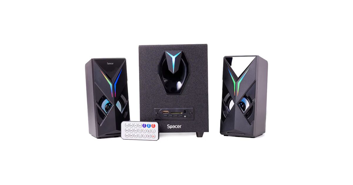 Głośniki Spacer Gaming 2.1, RMS: 14 W (2 x 3 W + 8 W), Bluetooth, pilot zdalnego sterowania, subwoofer z drewna MDF, USB/SD/AUX/FM, kolor czarny opis
