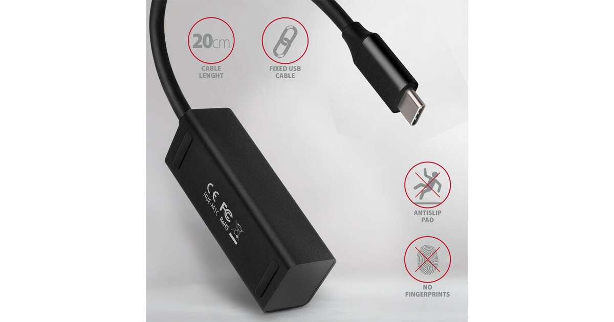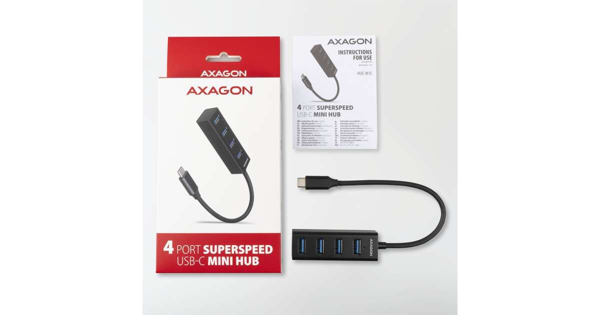 Axagon HUE-M1C. Interfejs hosta: USB 3.2 Gen 1 (3.1 Gen 1) Type-C, Interfejsy hub: USB 3.2 Gen 1 (3.1 Gen 1) Type-A. Realna szybkość przesyłania danych: 5000 Mbit/s, Kolor produktu: Czarny, Materiał obudowy: Aluminium. Typ zasilacza: USB. Obsługiwane systemy operacyjne Windows: Windows 10, Windows 10 x64, Windows 7, Windows 7 x64, Windows 8, Windows 8 x64, Windows 8.1,..., Obsługiwane systemy operacyjne Mac: Mac OS X 10.4 Tiger, Mac OS X 10.5 Leopard, Mac OS X 10.6 Snow Leopard, Mac OS X 10.7 Lion, Mac OS..., Obsługiwany systemy operacyjne Linux: Kernel 2.6, Kernel 2.6.31, Kernel 2.6.33. Szerokość produktu: 24 mm, Głębokość produktu: 18 mm, Wysokość produktu: 70 mm