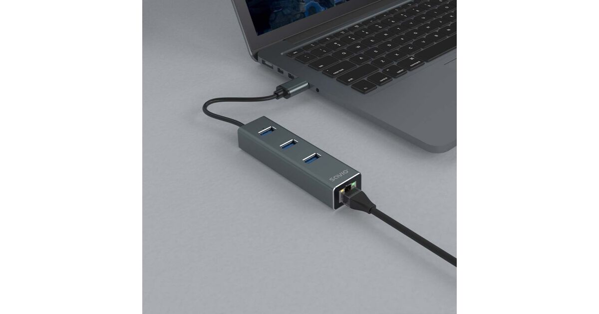 Hub USB Centrmezgls Savio 3-portowy USB-A 3.1 Gen 1 z portem RJ-45 Gigabit Ethernet opis