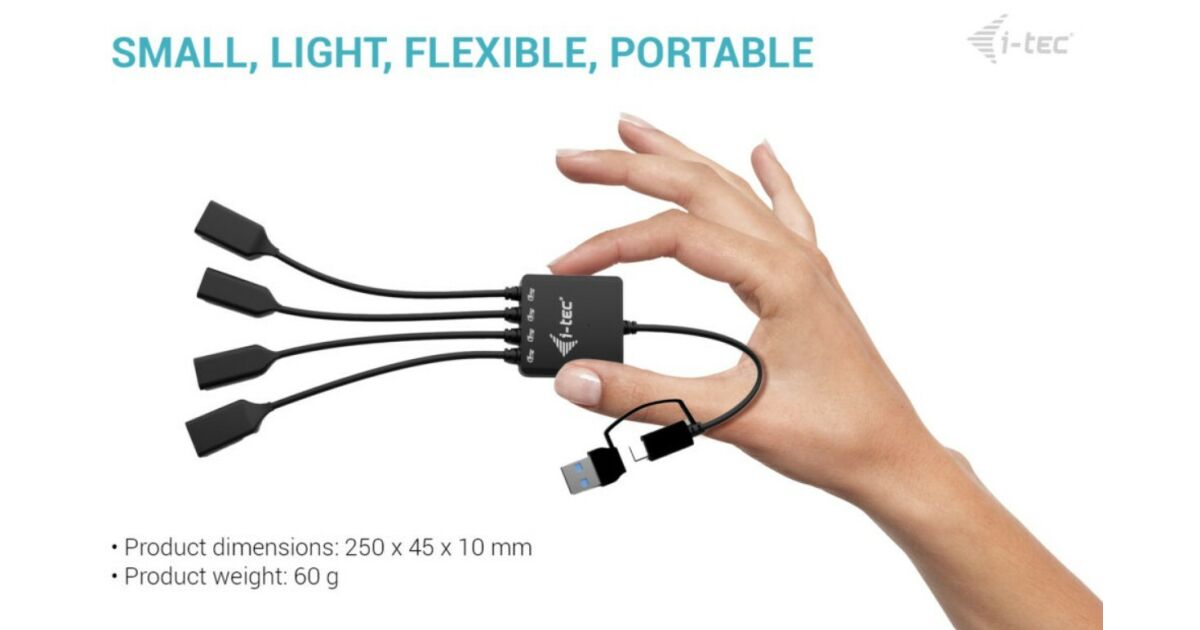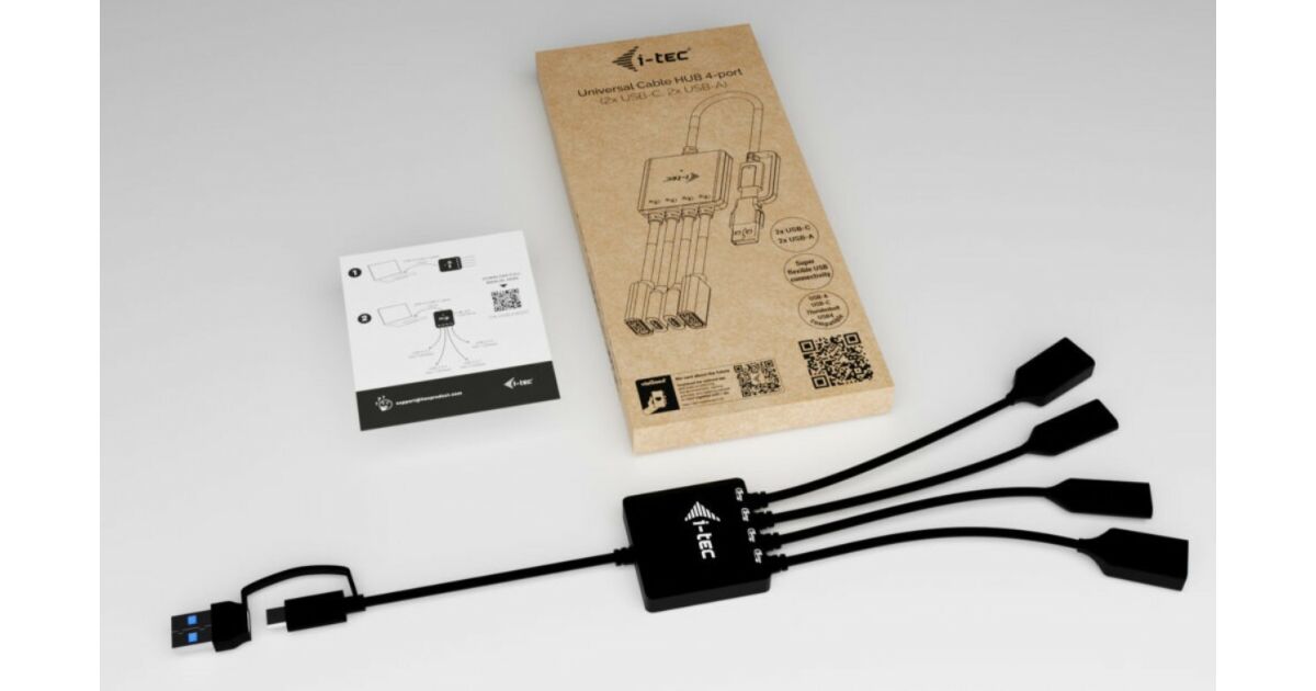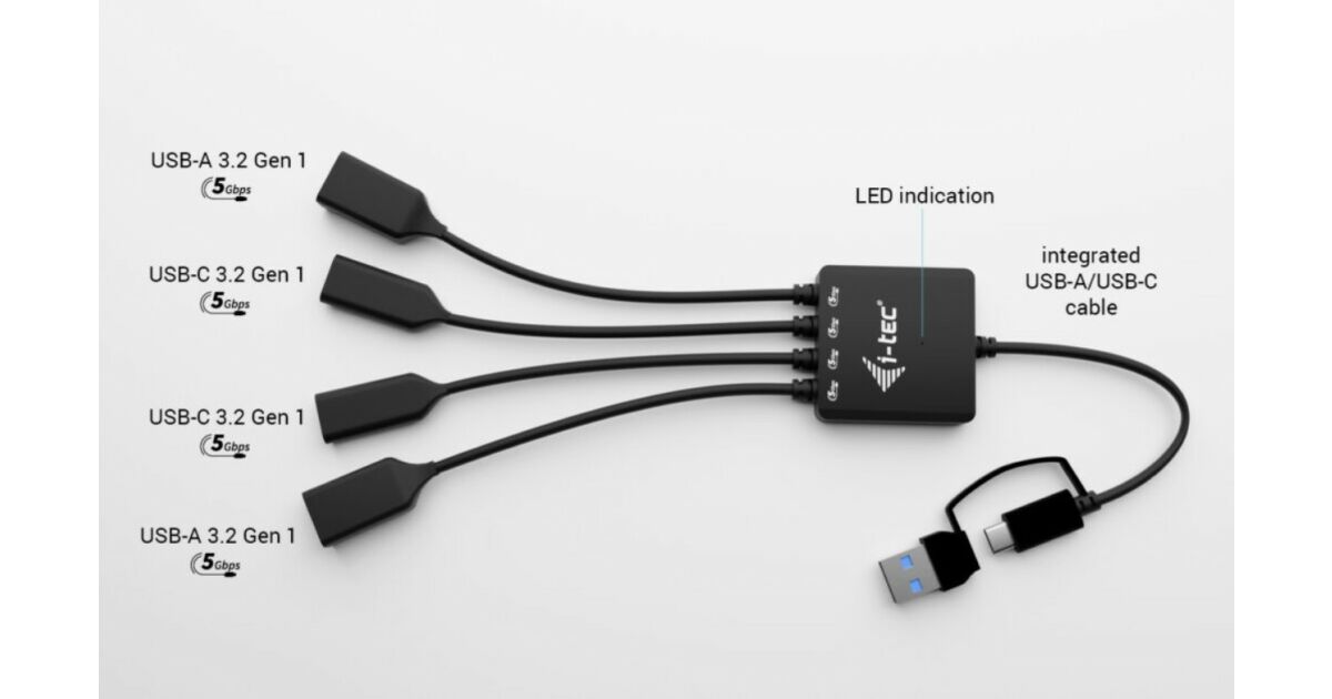 i-tec USB-C/USB-A Cable HUB 4 port (2x USB-C, 2x USB-A). Interfejs hosta: USB 3.2 Gen 1 (3.1 Gen 1) Type-A + Type-C, Interfejsy hub: USB 3.2 Gen 1 (3.1 Gen 1) Type-A, USB 3.2 Gen 1 (3.1 Gen 1) Type-C. Realna szybkość przesyłania danych: 5000 Mbit/s, Kolor produktu: Czarny, Długość kabla: 0,1 m. Obsługiwane systemy operacyjne Windows: Windows 10, Windows 11, Pozostałe obsługiwane systemy operacyjne: Android, ChromeOS, iPadOS. Szerokość produktu: 250 mm, Głębokość produktu: 45 mm, Wysokość produktu: 10 mm. Ilość na paczkę: 1 szt.