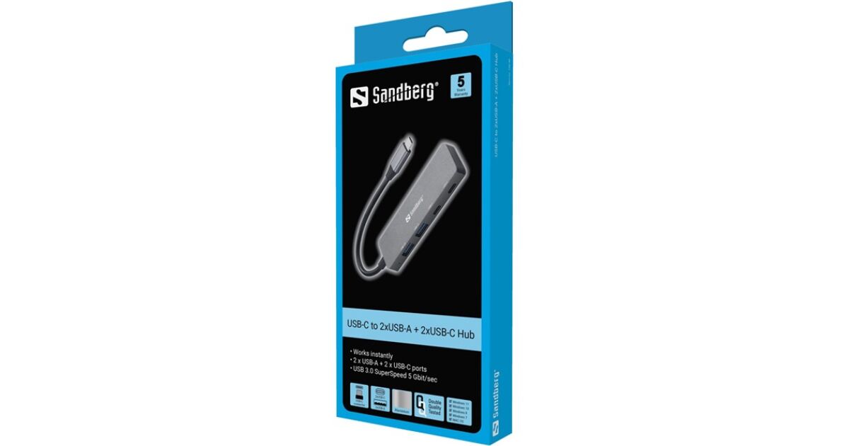 Chcesz zwiększyć liczbę portów USB-C w swoim laptopie lub komputerze? Z hubem Sandberg USB-C z łatwością dodasz 2 porty USB-A i 2 porty USB-C do swojego urządzenia. To idealne rozwiązanie, jeśli chcesz podłączyć kilka urządzeń jednocześnie, na przykład pendrive'a, mysz, klawiaturę lub zewnętrzny dysk twardy.