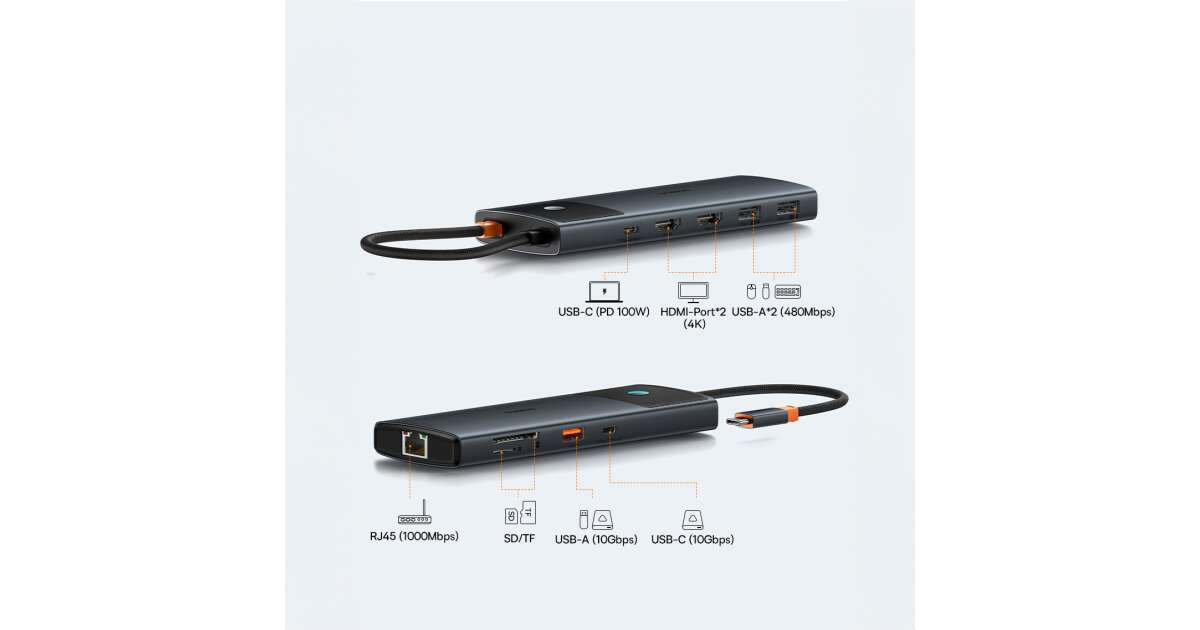 Hub 10w1 Baseus, USB-C na 2x HDMI, 3x USB-A, USB-C, RJ45, SD/TF, PD, czarny opis