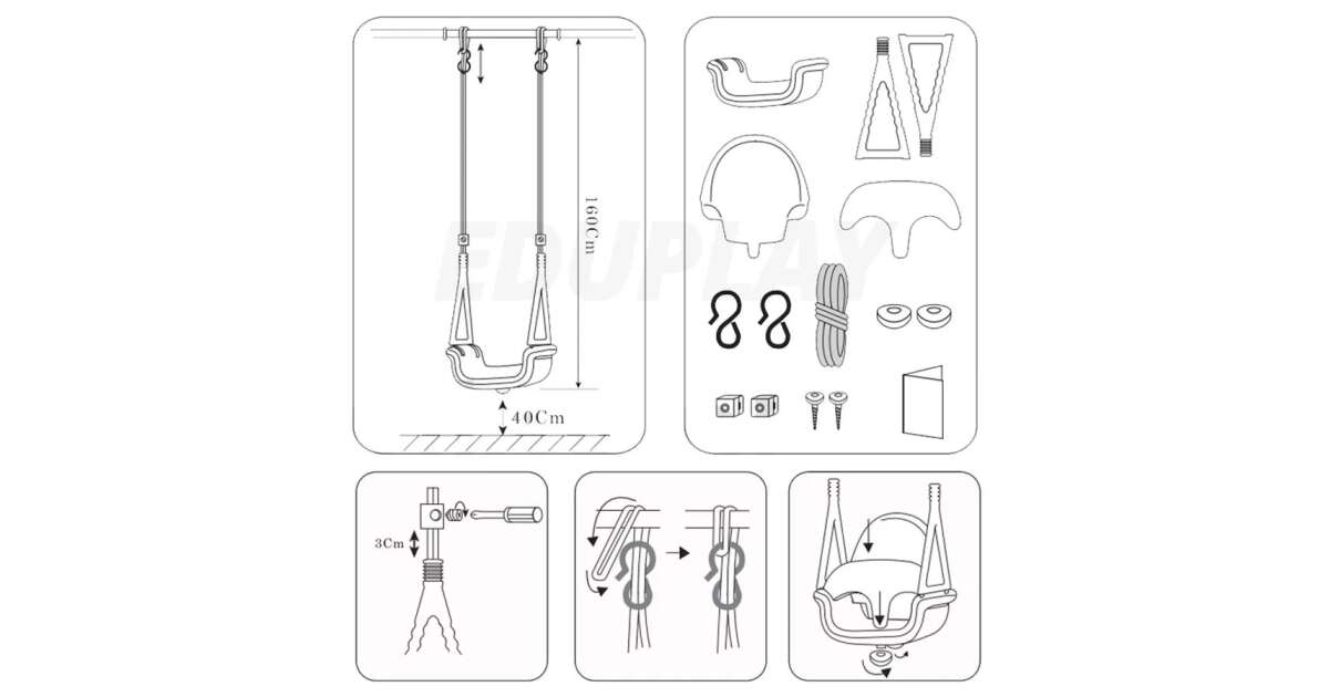 Wytrzymałe liny o długości do 130 cm można regulować za pomocą metalowych klipsów i są one zabezpieczone specjalnym tworzywem sztucznym, które chroni dłonie dziecka przed ewentualnymi otarciami i zwiększa stabilność podczas huśtania.