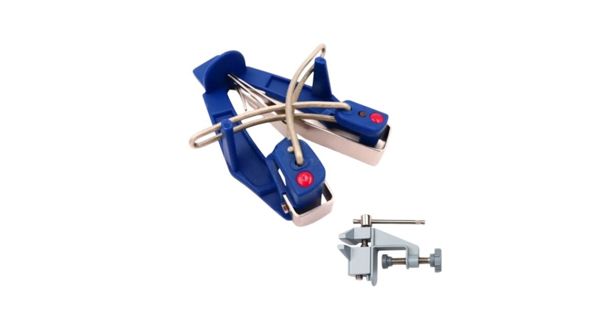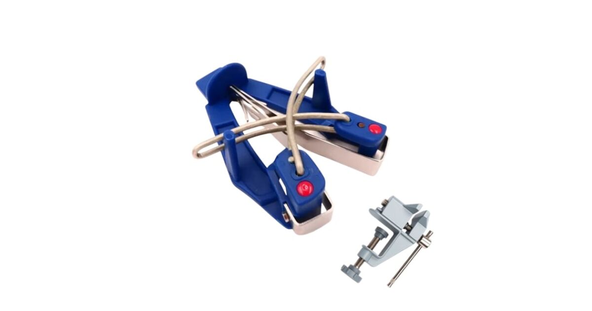 Ostrzałka do noży Sharp Easy i miniaturowy imadło żeliwne, zacisk stołowy, zestaw 2 w 1, niebiesko-szary opis