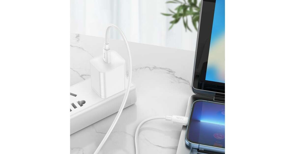 Szybkoładujący kabel USB-C – Lightning od Hoco. Umożliwia szybkie ładowanie z mocą do 100 W i transfer danych. Obsługuje protokół Power Delivery, a dzięki dużej mocy pozwala na ładowanie laptopów. Ładuj błyskawicznie nawet duże urządzenia! Kabel jest kompatybilny z protokołem PD i nadaje się do zasilania wielu różnych urządzeń o zapotrzebowaniu na moc do 100 W, w tym również laptopów. Szybkie ładowanie oznacza, że w krótkim czasie naładujesz baterię swojego smartfona (lub innego urządzenia) do pełna. Bezpieczeństwo przede wszystkim: temperatura złączy kabla jest utrzymywana na stałym poziomie, dzięki czemu nie musisz się obawiać ich przegrzania i uszkodzenia baterii – nawet, gdy korzystasz z urządzenia w czasie ładowania. Długi przewód o długości 1 m zapewnia komfortowe użytkowanie smartfona w trakcie ładowania. Specyfikacja:Moc: 100 WNatężenie prądu: 6 AZłącza: USB-C – LightningDługość: 1 mMateriał: PVCWaga: 29 gWsparcie technologii szybkiego ładowania: Power DeliveryInne: obsługa laptopa o mocy do 100 W (20 V / 6 A)Kolor: Biały