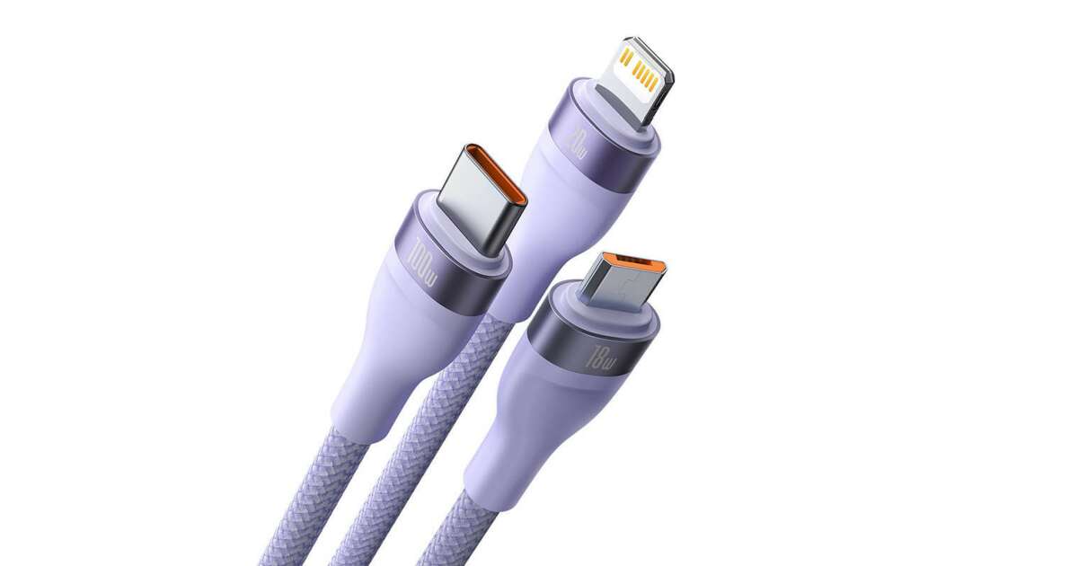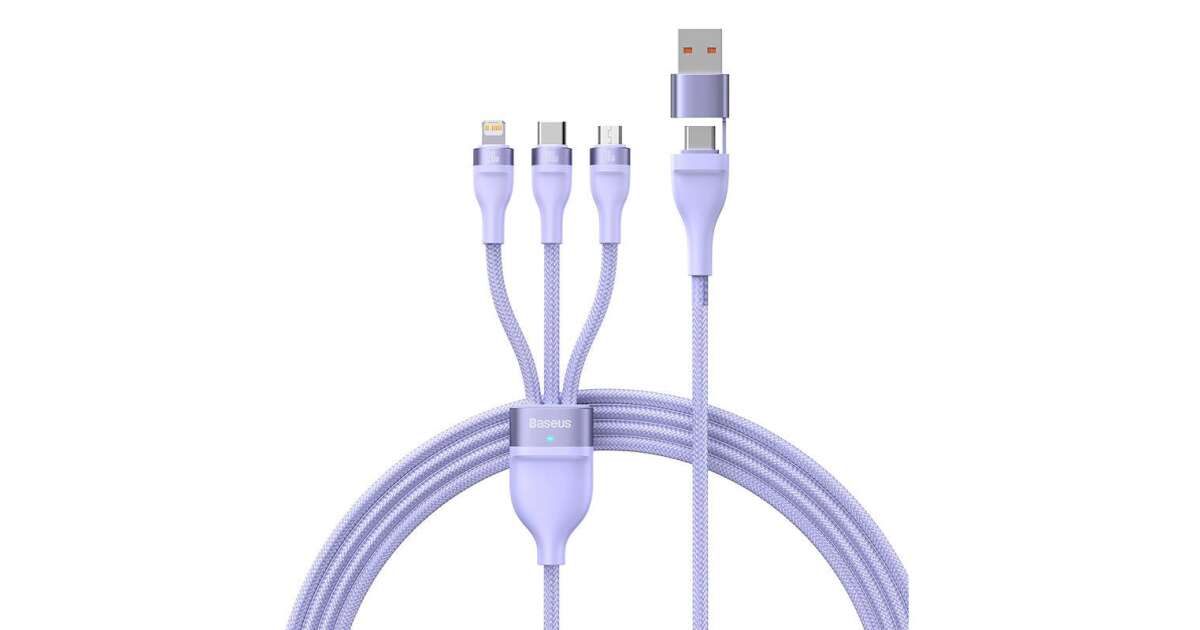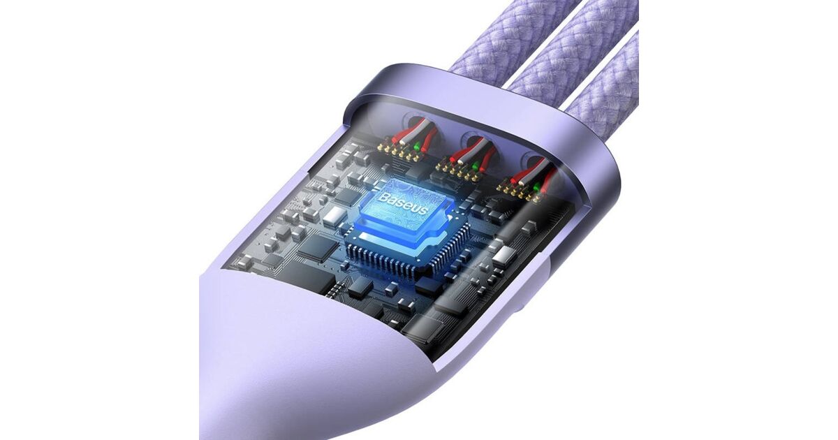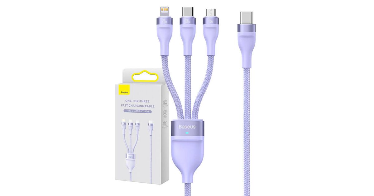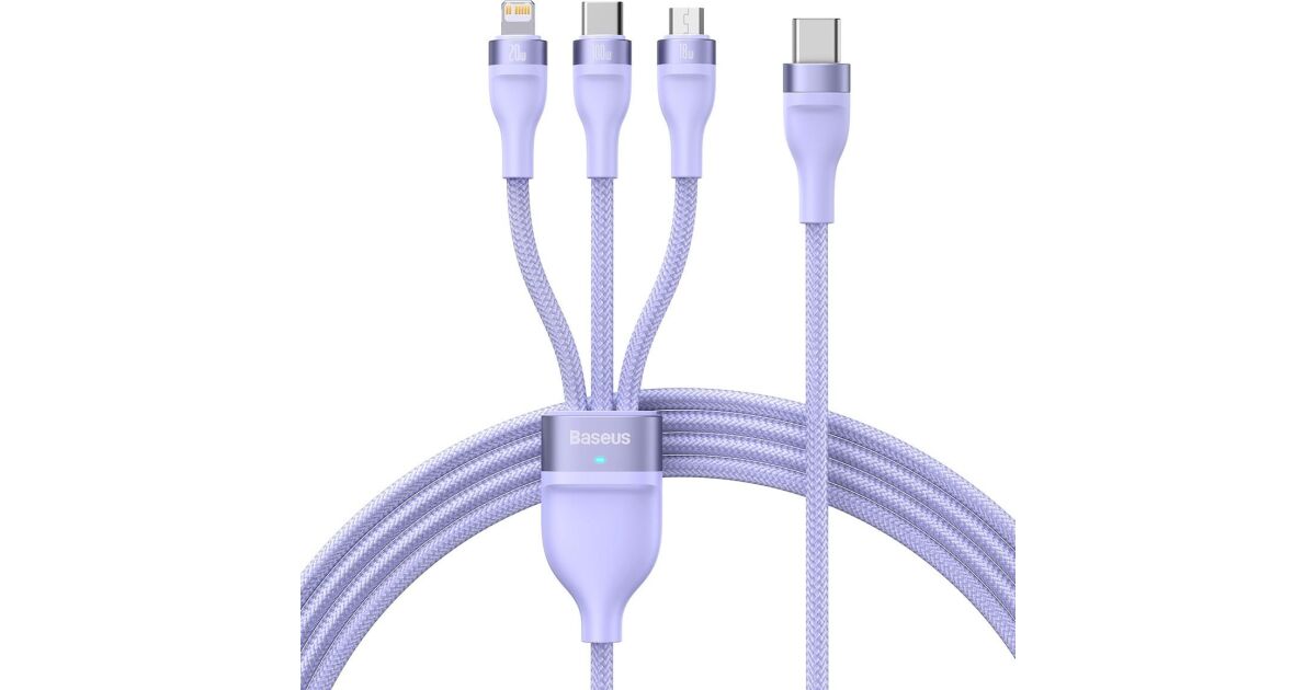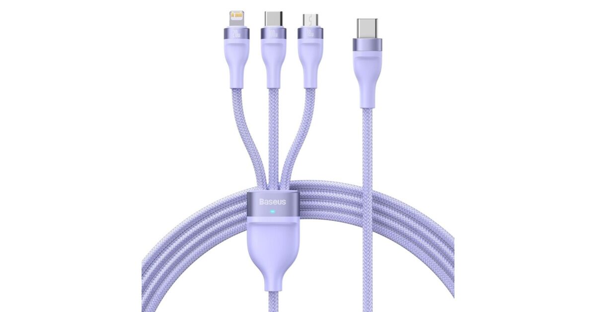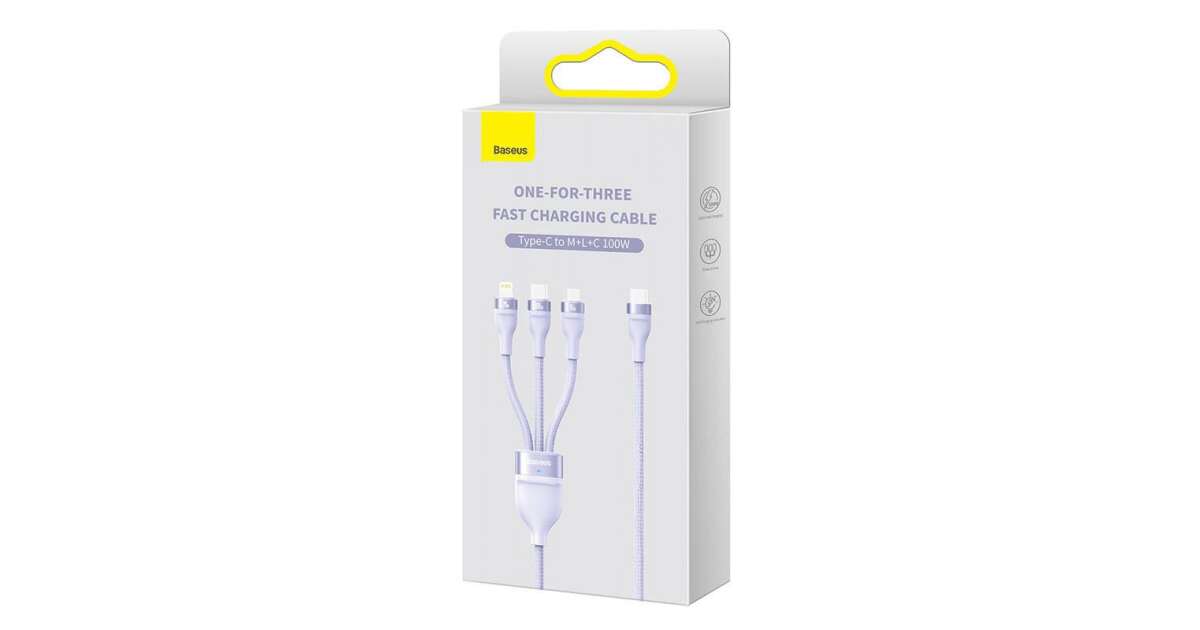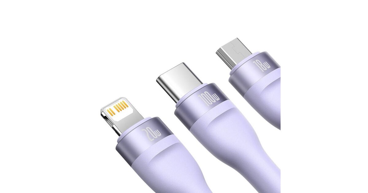 Kabel USB 3 w 1 Baseus Flash Series 2, USB-C + micro USB + Lightning, 100W, 1,5m, fioletowy opis