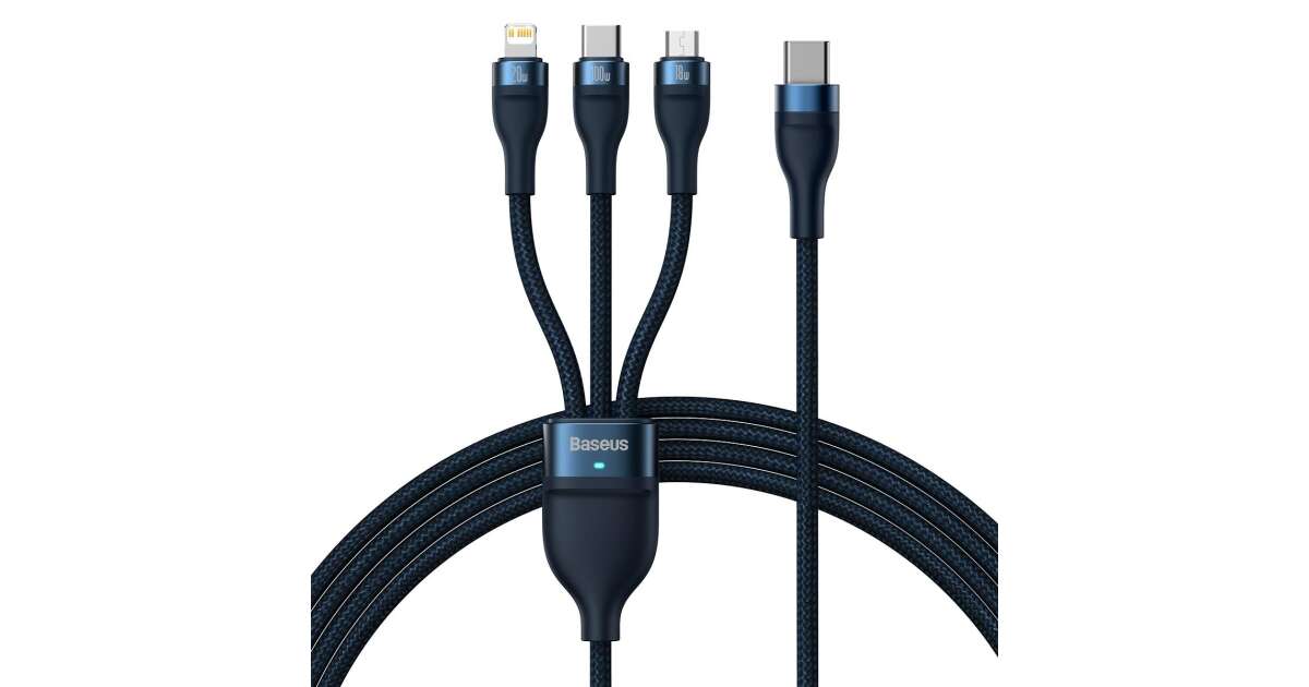 Kabel USB 3 w 1 Baseus Flash Series 2, USB-C + micro USB + Lightning, 100W, 1,5m, niebieski opis