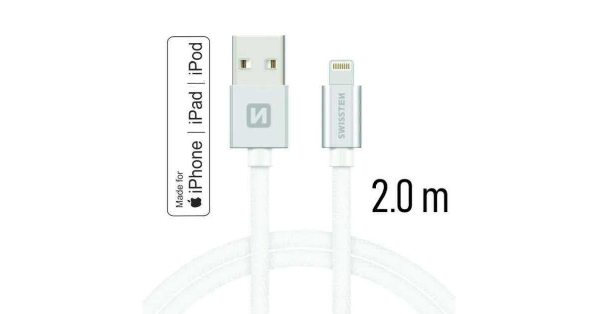 Kabel do transmisji danych i ładowania Swissten z powłoką tekstylną, USB/Lightning MFI, 2 m srebrno-biały opis