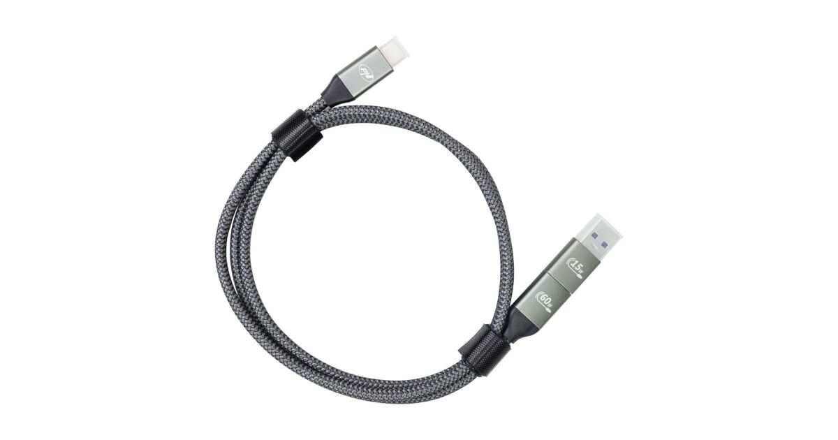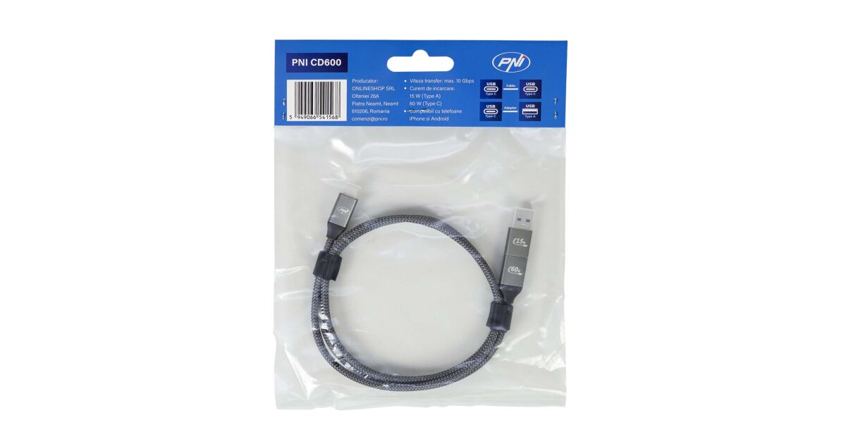 Kabel do transmisji danych i ładowania PNI CD600 USB typu C do typu C 60 W + adapter USB typu C do USB-A, długość 1 m opis