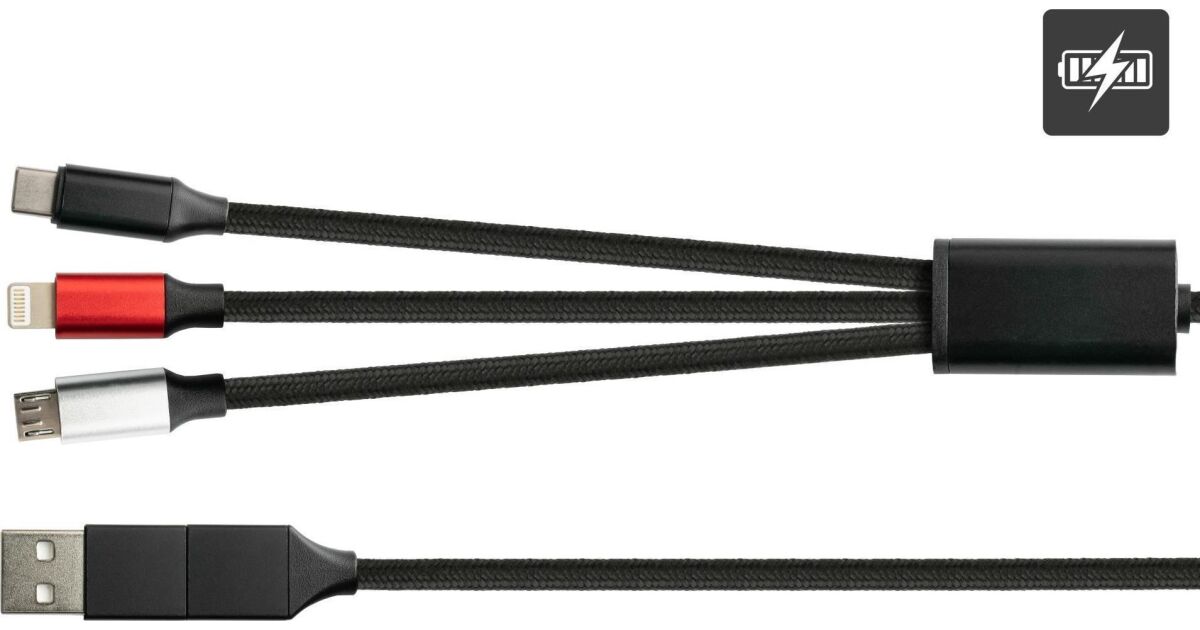 PYTHON PY-USB001S - 6-w-1 Ladekabel Zalety produktu Kabel pozwala na jednoczesne ładowanie do trzech urządzeń z jednego portu USB, co eliminuje problem z brakiem dostępnych portów. Dzięki sześciu różnym kombinacjom złączy, użytkownik nie musi martwić się o brak odpowiedniego kabla. Dodatkowo, kolorowe oznaczenia złączy ułatwiają ich identyfikację. Specyfikacja Typ: 6-w-1 kabel USB Długość: 1,0 m Złącza: USB-C™, Micro B, Lightning™ Materiał: tekstylna osłona Maksymalny prąd ładowania: 3 A Wysokiej jakości aluminiowe obudowy wtyków Złocone styki dla lepszej przewodności Brak funkcji przesyłania danych