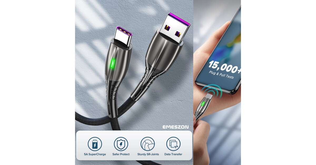 Ten kabel USB-C od Emeszon® nie tylko szybko ładuje Twój telefon lub tablet, ale jest też niesamowicie wytrzymały! Według testów wytrzymuje aż 15 000 podłączeń i 35 000 zgięć, więc będzie Ci służył przez długie lata.