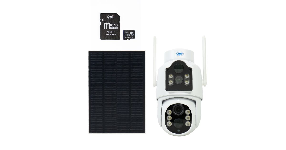 Pakiet kamery do monitoringu wideo PNI IP792, podwójny obiektyw 2 MP + 2 MP, panel słoneczny 3 W i karta pamięci MicroSD PNI 128 GB w zestawie