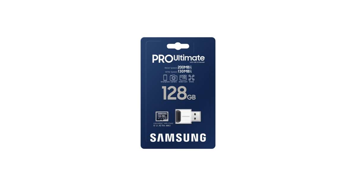 Pamięć Samsung Karta micro SD PRO Ultimate 128 GB z czytnikiem USB, UHS-I, odczyt 200 MB/s - zapis 130 MB/s, U3, V30, A2