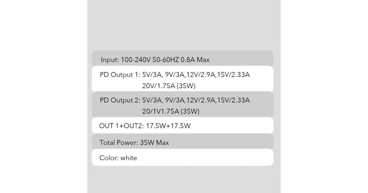 | Wyjście USB-C2 (PD) | 5V/3A, 9V/3A, 12V/2.9A, 15V/2.33A, 20V/1.75A (35W) |