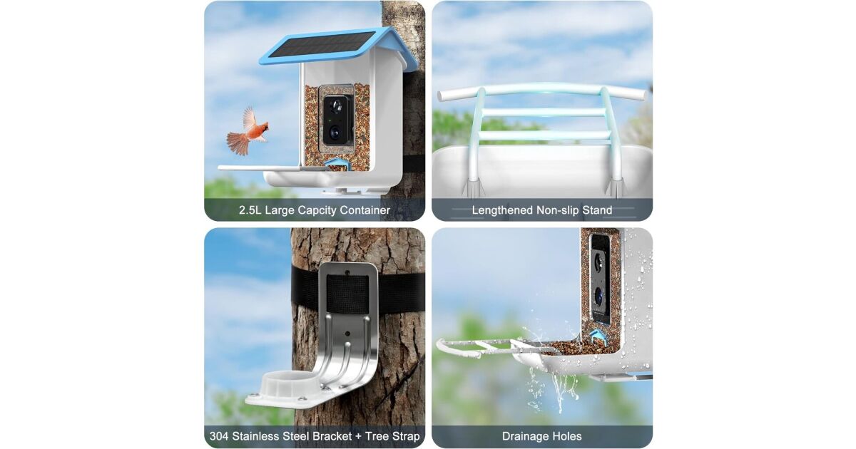 Sztuczna inteligencja rozpoznaje ponad 11 000 gatunków ptaków: inteligentna kamera wykorzystuje unikalną technologię opartą na sztucznej inteligencji, aby zidentyfikować do 11 000 gatunków ptaków. Opatentowana konstrukcja karmnika z panelem akrylowym sprawia, że pokarm jest widoczny i atrakcyjny dla nadlatujących ptaków. Kamera HD 1080P: 2-megapikselowa kamera o rozdzielczości 1080P i szerokim kącie widzenia 130 stopni pozwala na obserwację ptaków w dzień i w nocy. Steruj wbudowaną kamerą za pomocą aplikacji mobilnej, aby robić zdjęcia i nagrywać dynamiczne filmy. Wbudowany mikrofon dwukierunkowy pozwala słuchać śpiewu ptaków w czasie rzeczywistym. Wbudowana bateria słoneczna: bateria o pojemności 5200 mAh i niskim zużyciu energii może działać w trybie czuwania przez około 4 miesiące. Urządzenie obsługuje dokładne statystyki zużycia energii w czasie rzeczywistym i powiadomienia o niskim poziomie naładowania baterii. Panel słoneczny zapewnia stałe źródło energii dla karmnika. Stabilne połączenie WiFi 2,4 GHz: kamera obsługuje tylko WiFi 2,4 GHz, które jest bardziej niezawodne niż pasmo 5 GHz. (Zasięg Wi-Fi 5 GHz jest ograniczony i dostępny tylko w niektórych obszarach). Wybierz miejsce z dobrym sygnałem Wi-Fi do instalacji. Jeśli zasięg jest słaby, możesz dodać wzmacniacz sygnału, aby go wzmocnić. Udostępnianie wielu urządzeń: inteligentny podajnik można podłączyć do wielu urządzeń. Obsługa do 4 urządzeń mobilnych pozwala na jednoczesne oglądanie transmisji na żywo. Dziel się radością obserwacji ptaków z rodziną, przyjaciółmi i partnerami!