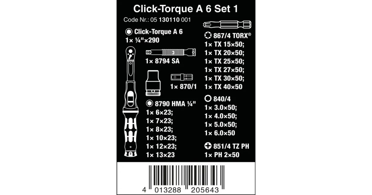 Zestaw klucza dynamometrycznego Wera Click-Torque A6 to idealny wybór do wszystkich zadań, w których niezbędny jest precyzyjny pomiar momentu obrotowego!