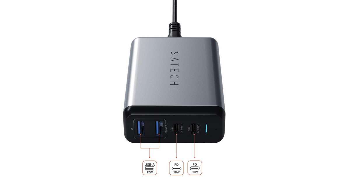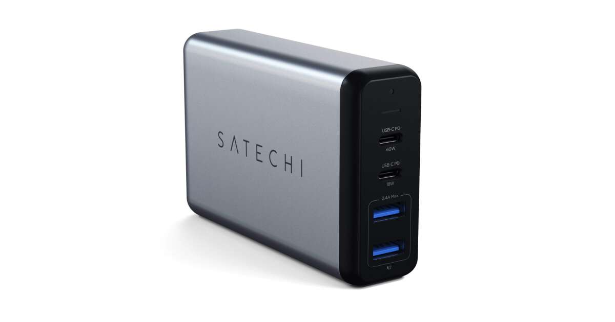 Ładowarka podróżna Satechi Dual Type-C PD, 2x USB-C, 2x USB-A, maks. moc całkowita 75 W, szara opis