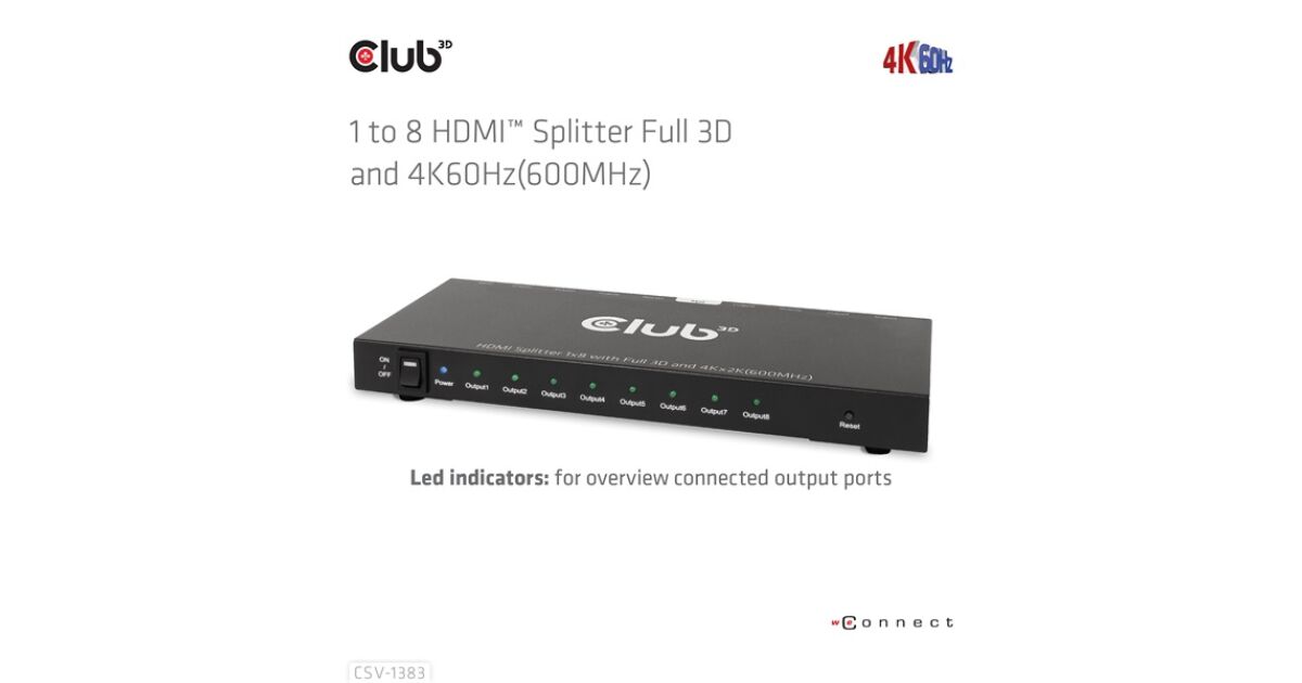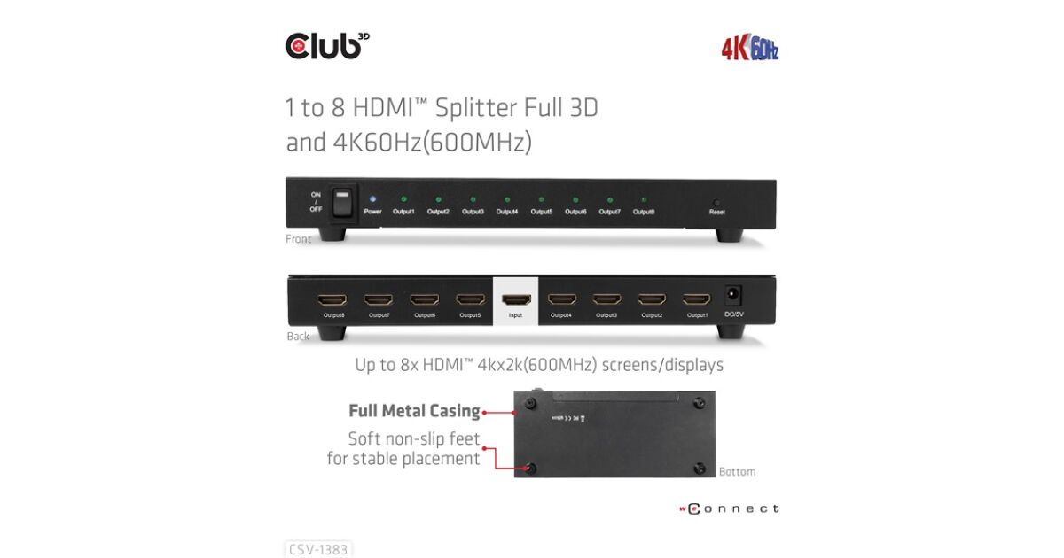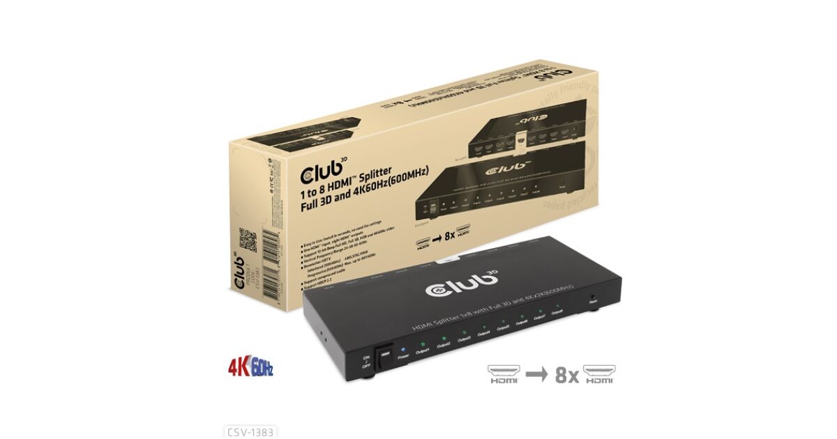 Club 3D CSV-1383 to wysokowydajny i niewielki rozdzielacz od 1 do 8 HDMI™ Ultra High Definition z lutowaną i żelazną obudową. Rozdziela on sygnał wejściowy HDMI™ na osiem identycznych wyjść jednocześnie. Dostarcza wysokiej jakości sygnały audio i wideo przez kable HDMI™ do rozdzielczości 4K@60Hz i jest w stanie odbierać i przesyłać do przepustowości 6Gbps/600MHz.