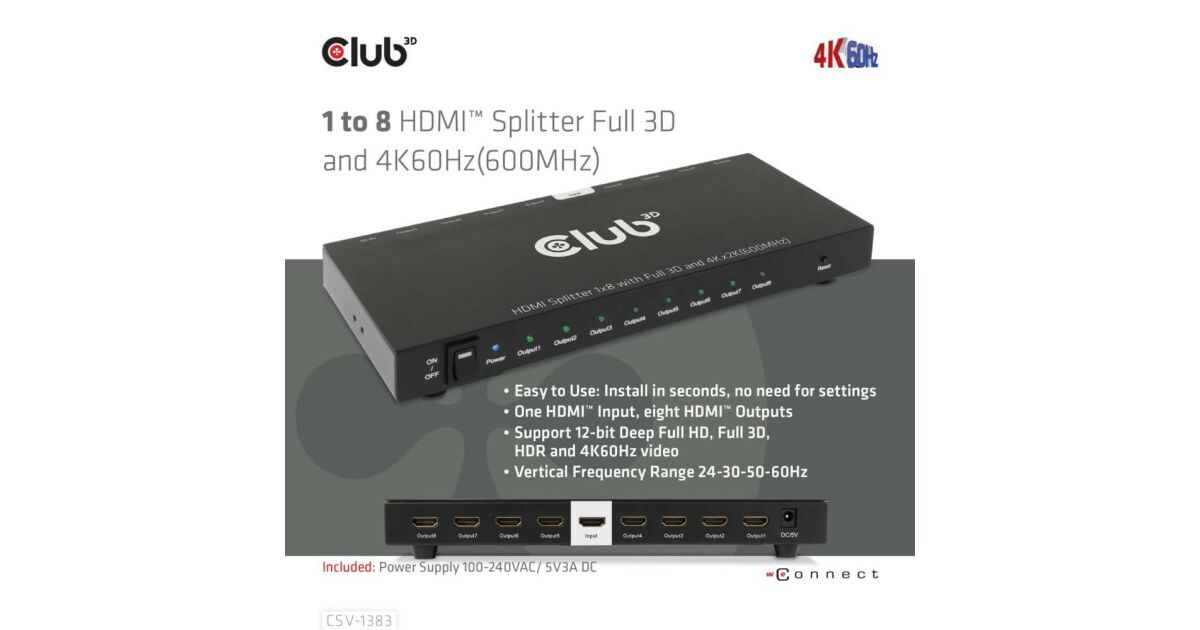 Club 3D Splitter - CSV-1383 (1 do 8 HDMI, 4K60Hz, HDR, Full 3D, 6Gbps, 12-bit Deep Color)