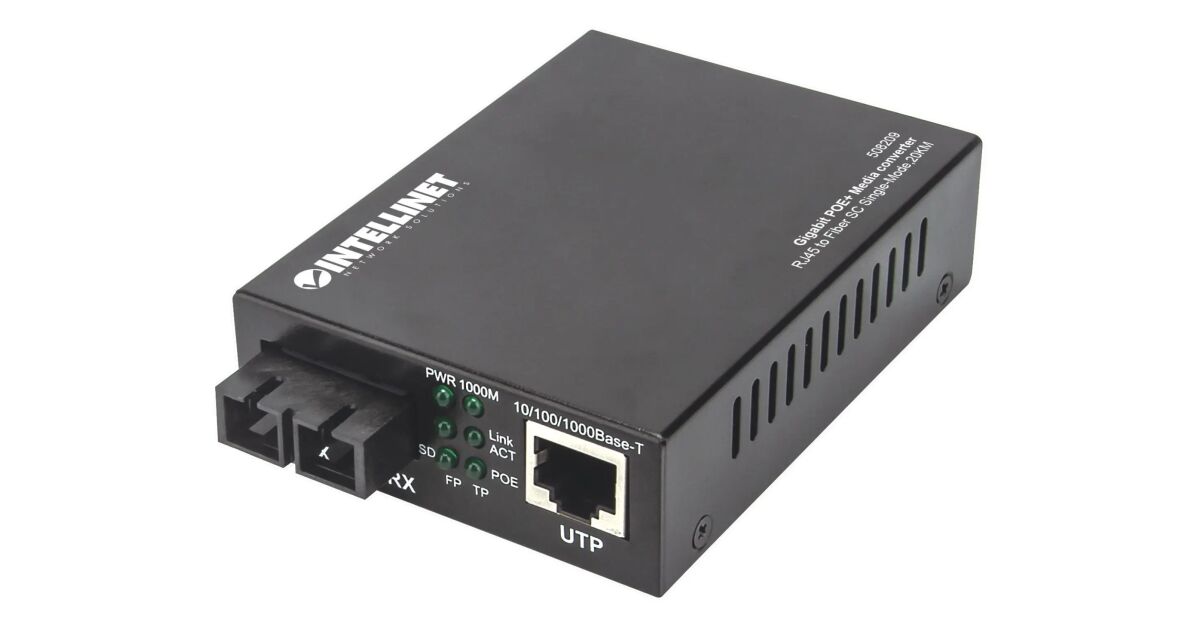 Intellinet 508209. Maksymalna szybkość przesyłania danych: 1000 Mbit/s, Konwerter interfejsu wyjściowego: 1000Base-T, Konwerter interfejsu wejściowego: 1000Base-LX. Maksymalny dystans transferu: 20000 m, Długość fali: 1310 nm, Struktura światłowódu jednomodowego: Pojedynczy. Diody LED: Działanie, Link, PoE, Zasilanie, Kolor produktu: Czarny, Materiał obudowy: Metal. Złącze światłowodowe: SC, Technologia łączności: Przewodowa. Napięcie: 56 V, Prąd wejściowy: 0.5 A, Całkowita Power over Ethernet (PoE) budżetu: 30 W